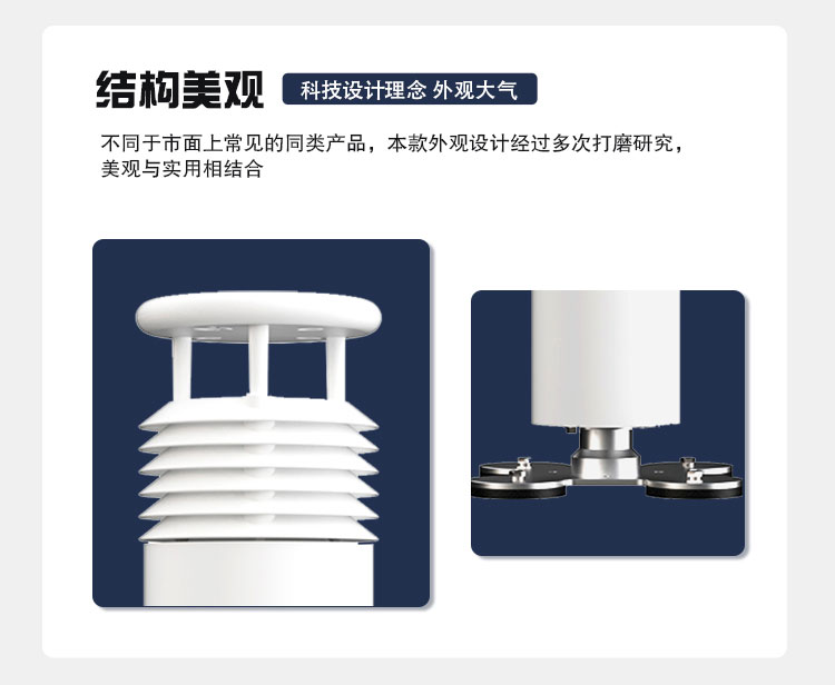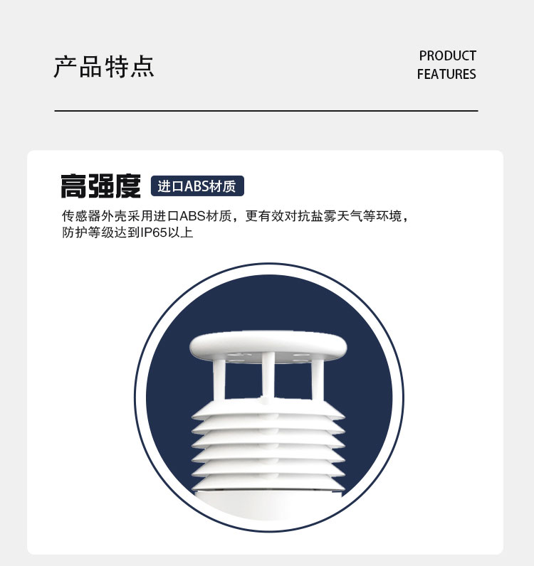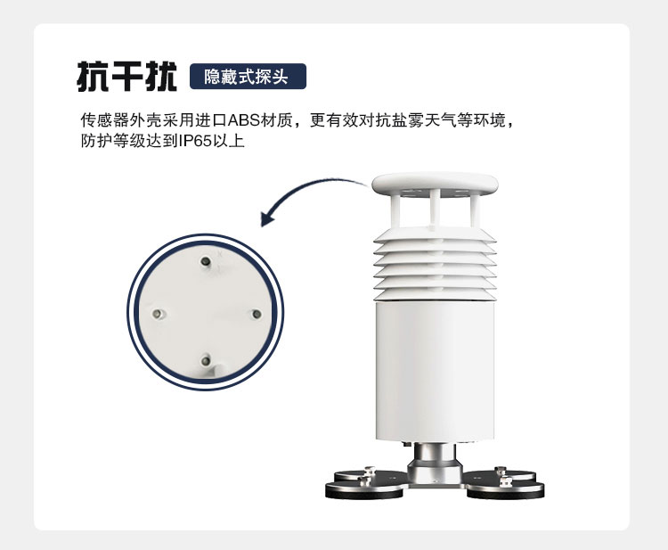 该设备采用二要素一体式传感器,可对风速、风向进行实时观测,传感器外壳采用进口ABS材质,更有效对抗盐雾等环境,防护等级达到IP65以上。