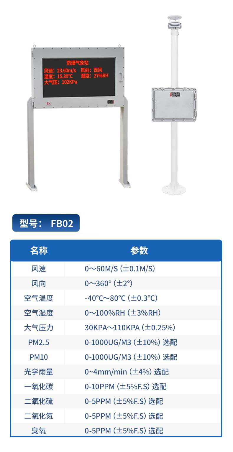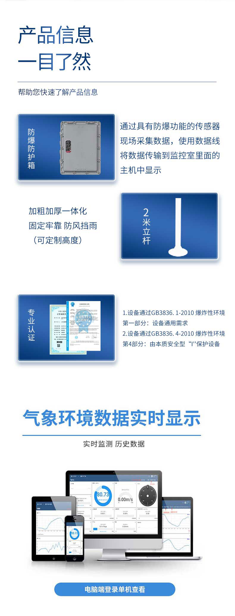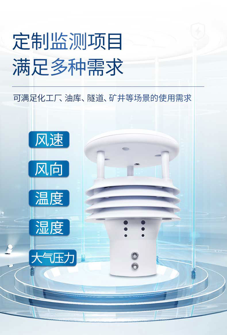 防爆气象仪创新性地将风速、风向、温度、湿度、大气压力通过一个高集成度结构来实现,可实现户外气象参数24小时连续在线监测,通过数字量通讯接口将五项参数一次性输出给用户。
