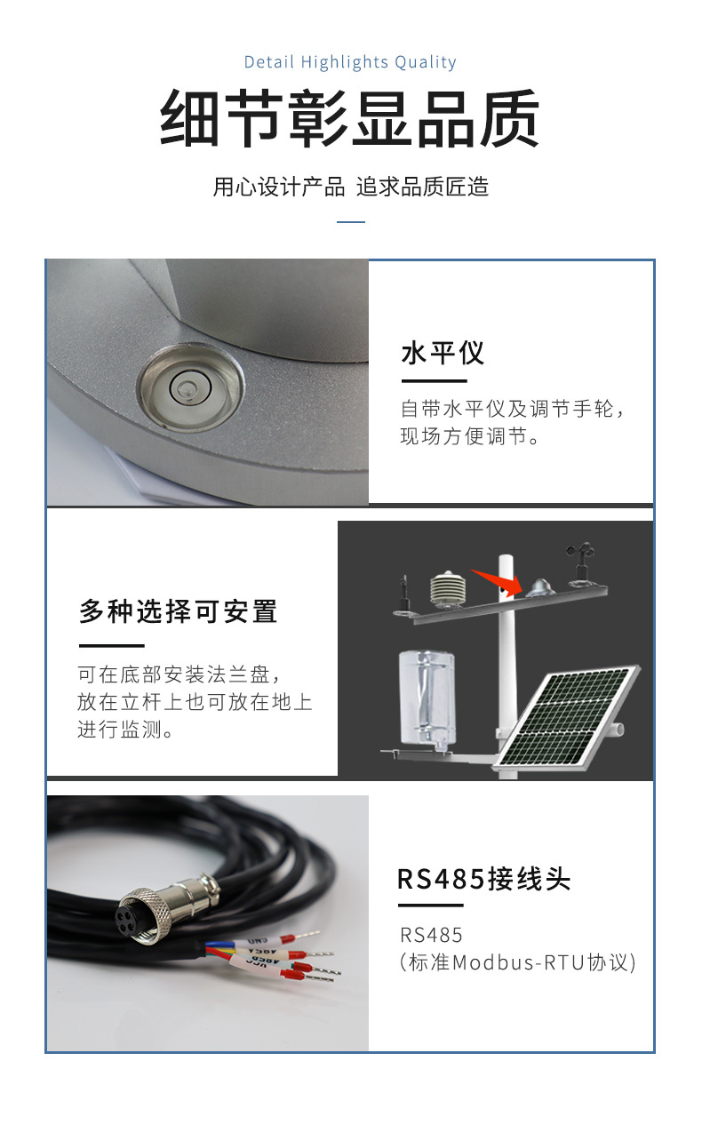 【产品简介】一、光电总辐射传感器技术指标供电:DC12V功耗:0.036W工作环境:-20~65℃通信接口:RS485工作电流:3mA@DC12V最短数据间隔:0.5S二、光电总辐射传感器参数···