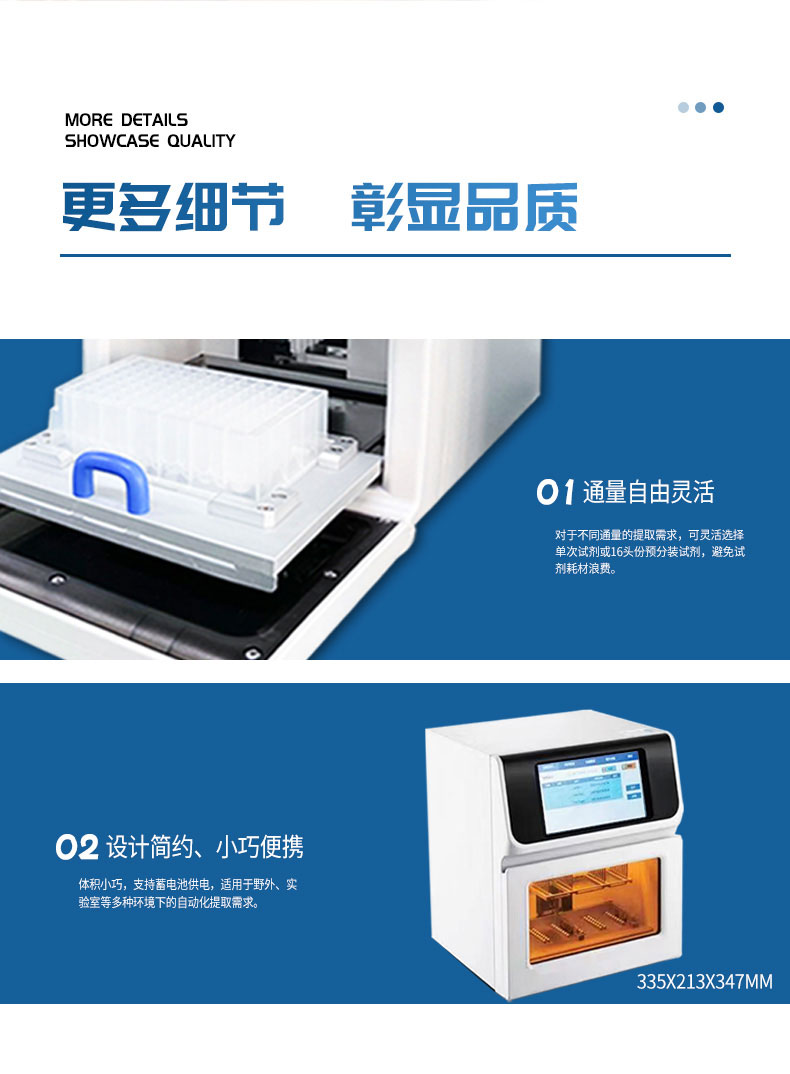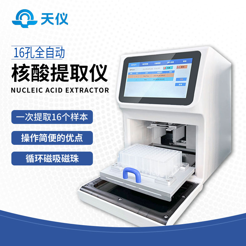 【产品简介】核酸提取仪产品概述:16孔位核酸提取仪通过磁珠法提取核酸,选择相应的试剂盒就可以自动的从多种样品材料如血液、组织、细胞中分离纯化高纯度的核酸。具有兼容性强(适配16头份提取试剂,也···