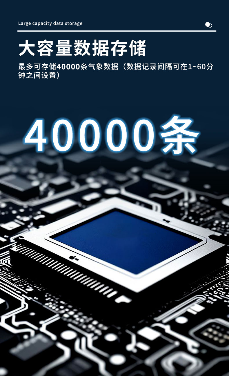 3.大容量数据存储,最多可存储40000条气象数据(数据记录间隔可在1~60分钟之间设置)。