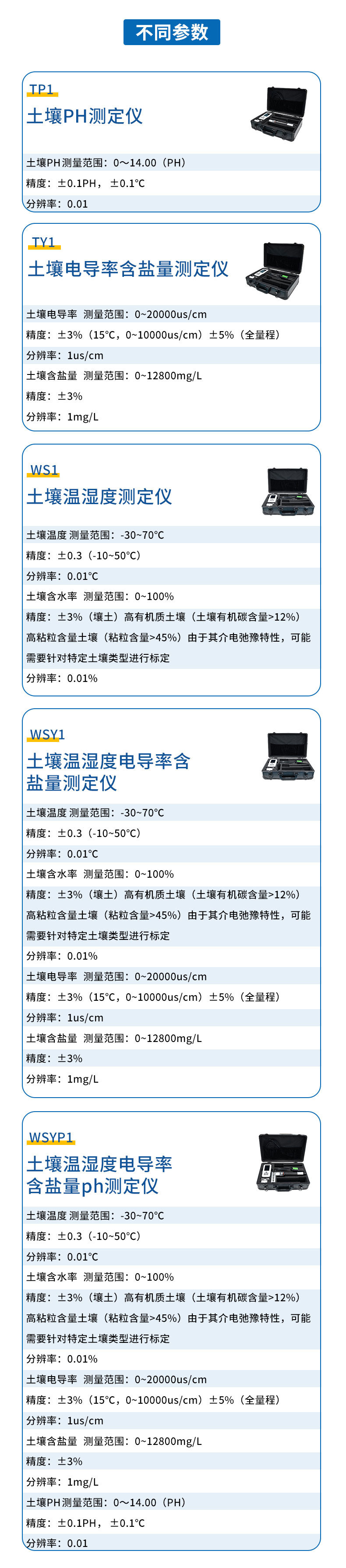 | 土壤含盐量 | 测量范围:0~12800mg/L 精度:±3% 分辨率:1mg/L |
