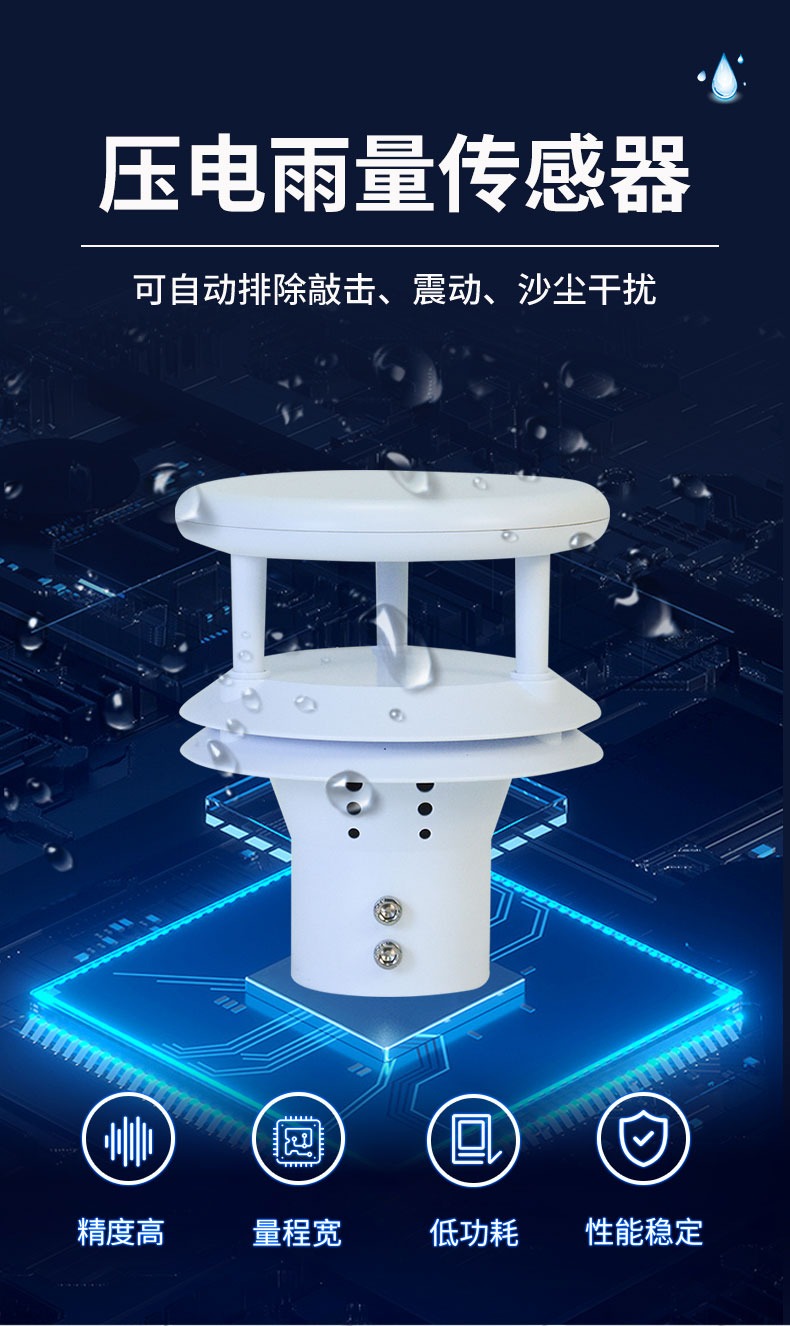 【产品简介】一、压电雨量传感器产品概述压电雨量传感器采用PVDF压电薄膜作为感雨器件,通过嵌入式AI神经网络分辨雨滴信号,避免因砂砾、灰尘、振动等干扰带来误触发。广泛应用于气象环境监测、水文水···
