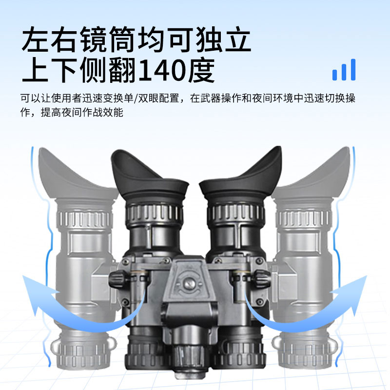 外壳材质为亚光黑色抗腐蚀高强度尼龙材料,头部支架快拆设计适配底座支架,兼容性强,坚固耐用。它采用2代+图像增像管(也可选配3代增像管),提供高分辨率的清晰画面。低功耗设计,静止时自动关机状态,低电量时系统指示灯。内置机体感应系统,上翻关机和自动待机功能的开启与关闭。左右镜筒均可独立上下侧翻140度,可以让使用者迅速变换单/双眼配置,在武器操作和夜间环境中迅速切换操作,提高夜间作战效能;配备外接电池盒(通过电源线连接),电池盒可以固定在头盔上。