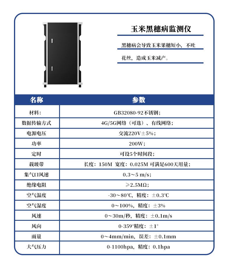 【产品简介】一、玉米黑穗病监测仪简介黑穗病会导致玉米果穗短小,不吐花丝,造成玉米减产。玉米黑穗病监测仪是集气象监测和智能孢子捕捉显微成像于一体的新型黑穗病监测装备。系统通过采集玉米种植区的生长···