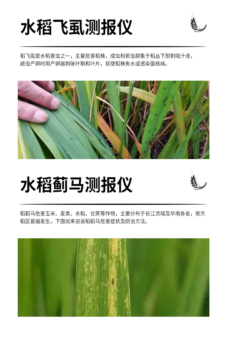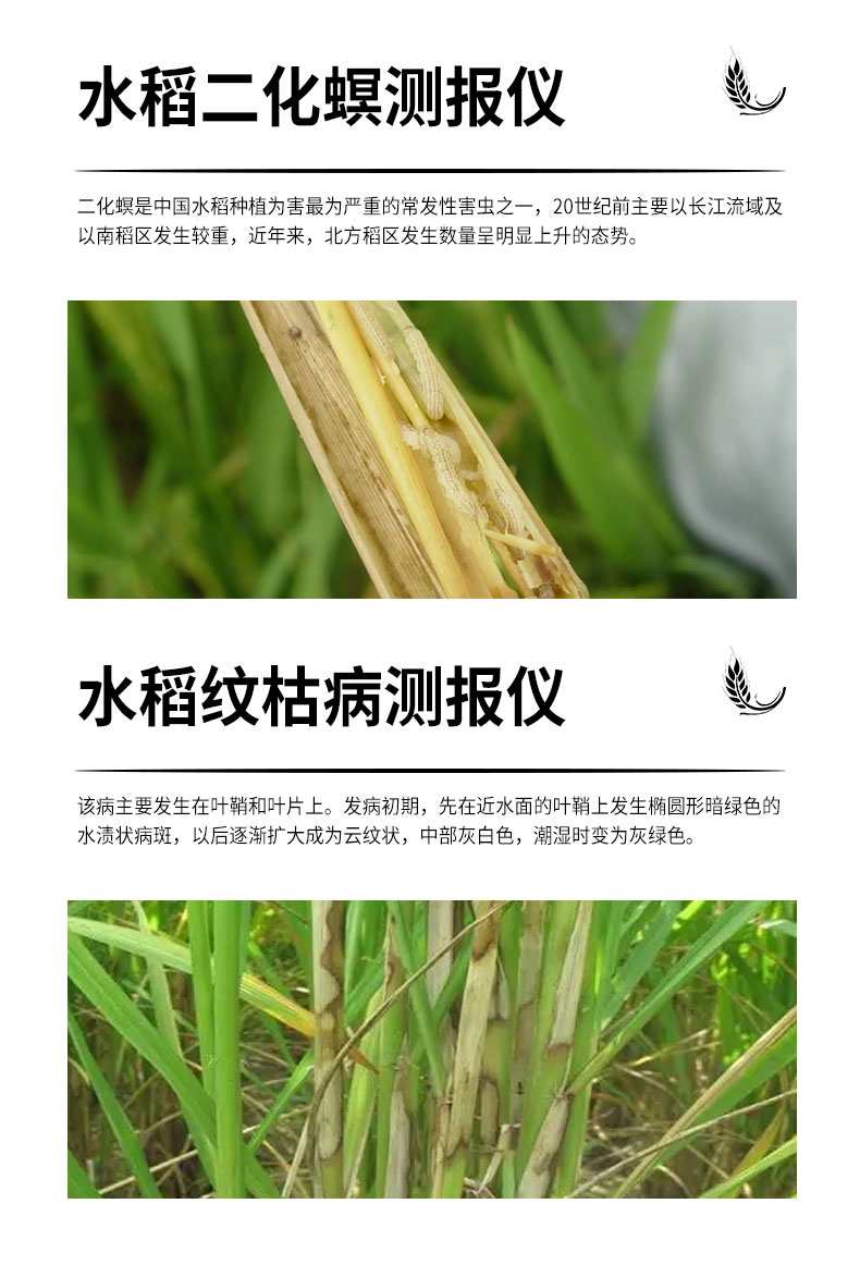 二化螟是水稻钻蛀性害虫,其幼虫蛀害水稻叶鞘、心叶、稻茎,造成枯鞘、枯心苗、白穗,成熟期造成半枯穗状虫伤株,导致严重减产。二化螟测报仪专为农林虫情测报而研制,该灯利用现代光、电、数控技术,实现了虫体远红外自动处理、自动拍照、整灯自动运行等功能。在无人监管的情况下,能自动完成诱虫、杀虫、拍照、收集、排水等系统作业。可增设风速风向、环境温湿度、光照等多种传感器接口,并可通过无线上传数据,以监测环境与病虫害之间的关系。广泛应用于农业水稻种植领域。