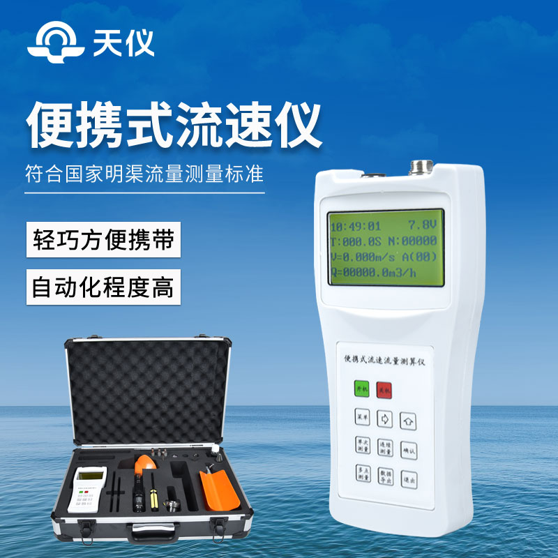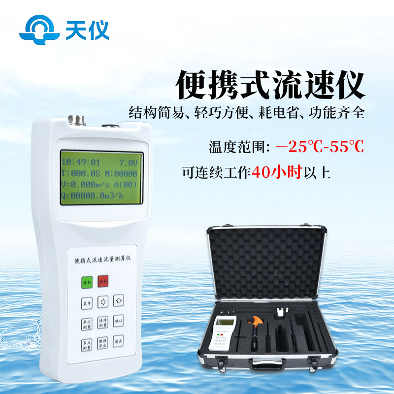 便携式流速仪主要由LS1206B型旋桨式流速传感器、流速测算仪、0.4m×4Ф16测杆组成。全套仪器置于高级铝合金密码箱内。接通信号线,即可进行各明渠中流速的测量,并自动显示流速。