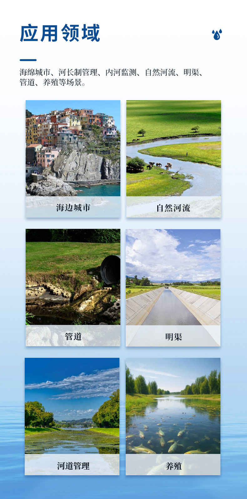海绵城市、河长制管理、内河监测、自然河流、明渠、管道、养殖等场景。