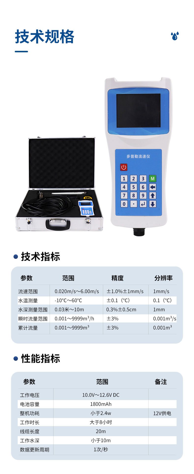 【产品简介】一、多普勒流速仪产品简介多普勒流速仪是应用于河流、明渠及管道等工况的流速流量检测仪器。其采用超声波探测技术,测量精度高、稳定性好、受环境因素影响小,无转动件、维护频次低、工作可靠性···