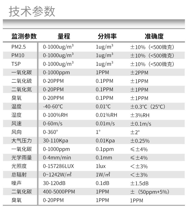 1、风速:量程:0~60m/s,精度:0.1m/s+0.01v,分辨率:±0.1m/s;