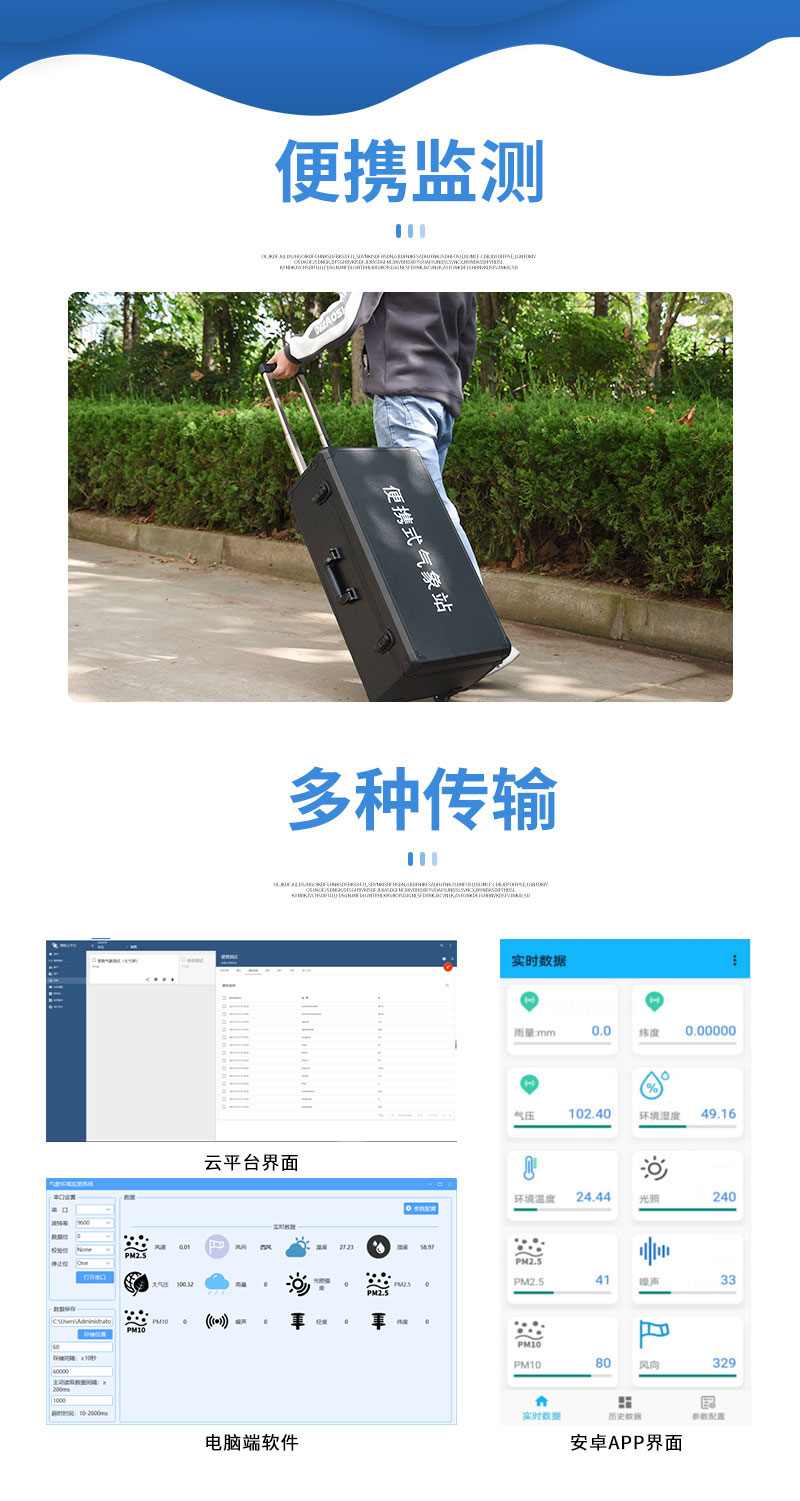 该设备支持有线、蓝牙、GPRS等传输方式,免调试,可快速布置,适用于各类应急气象短期观测、移动气象监测等气象数据的获取。广泛运用于气象、农林、环保、海洋、机场、港口、科学考察、校园教育等领域。