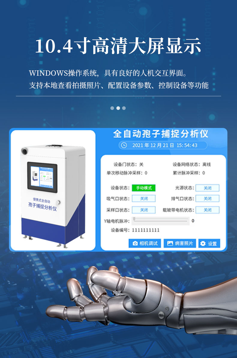 8.孢子捕捉仪内置10.4寸高清大屏显示,windows操作系统,具有良好的人机交互界面。支持本地查看拍摄照片、配置设备参数、控制设备等功能