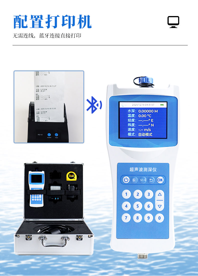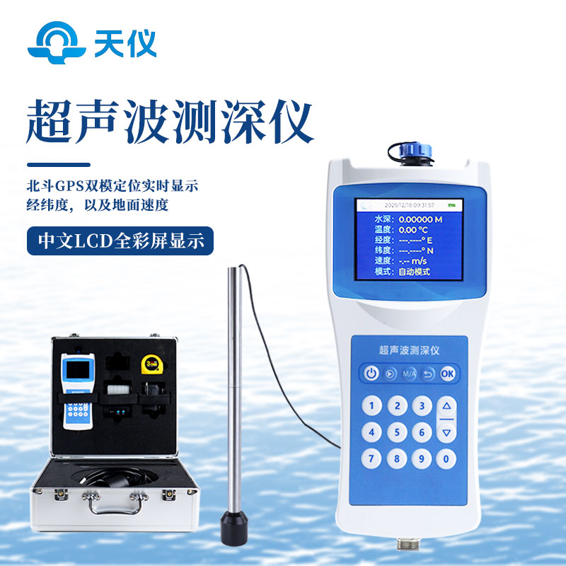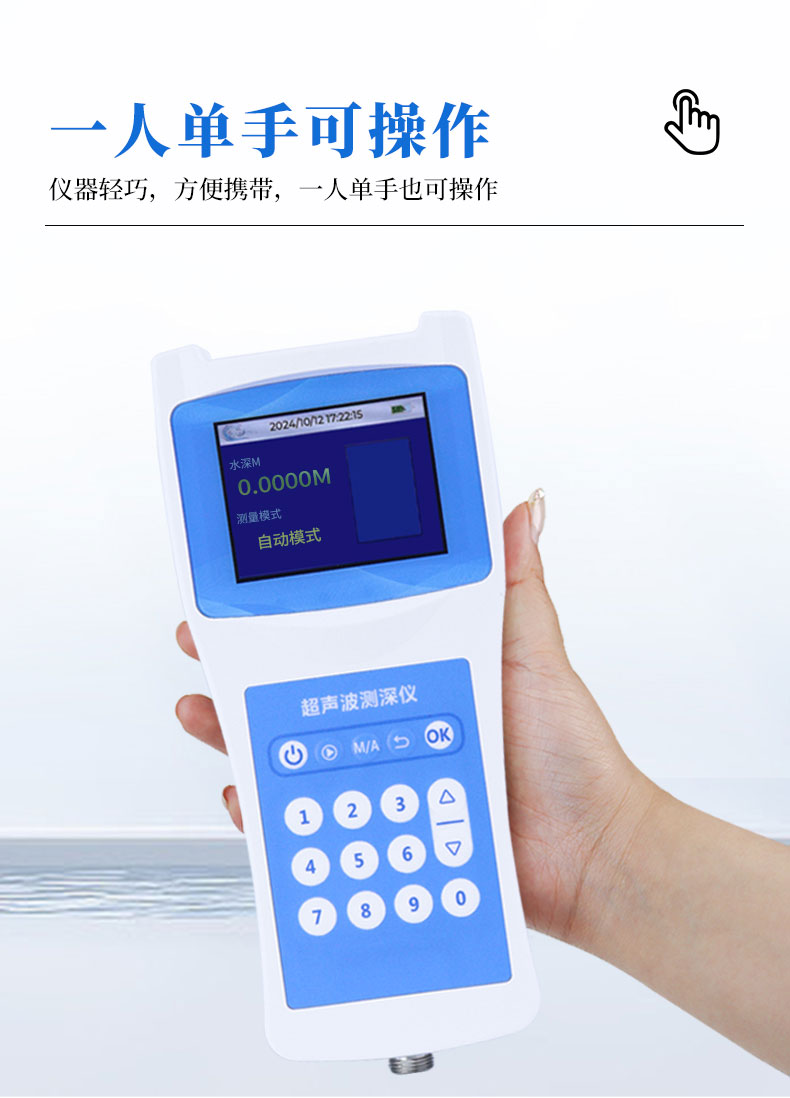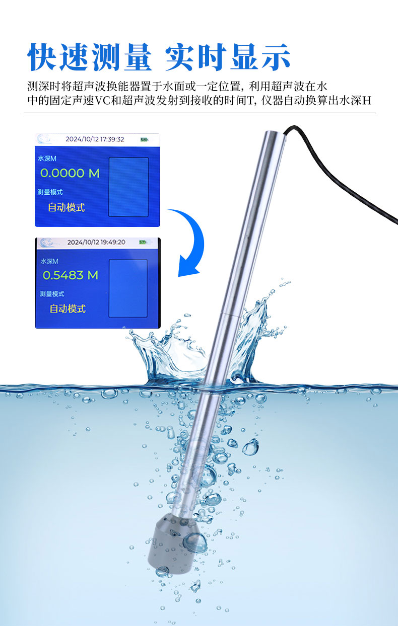水深水温探测仪是测量水库、湖泊、江河、浅海等水体的便携式测深仪,测深时将超声波换能器置于水面下一定位置,利用超声波在水中的固定声速VC和超声波发射到接收的时间T,仪器自动换算出水深H。本品是我司积累多年生产经验,吸取了多种同类产品优点,而开发的一款方便适用的手持式超声波测距仪表。超声波收发转换电路采用专用大规模集成电路,元件贴片率99%,并以液晶显示测深结果,保证了产品的长期可靠性,同时将其功耗降到了极低。具有测量精确、功耗低、可靠性高、使用方便、操作简单、测量速度准确、携带方便等优点。仪器可在静水中测深,也可在具有一定速度的水中测深;水流速度≤5m/秒,是水文测验、水电厂库区、湖泊、河道勘测和环境水域监测的理想水深测量仪器。