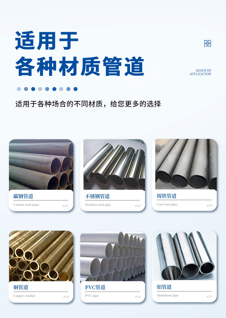 | 可测管道 | 管材 | 钢、不锈钢、铸铁、PVC、PE、PPR铜、铝、水泥管等一切质地密致管道,允许有衬里(塑料尽量控制壁厚小于8mm,否则不密实会不能测量)。 |