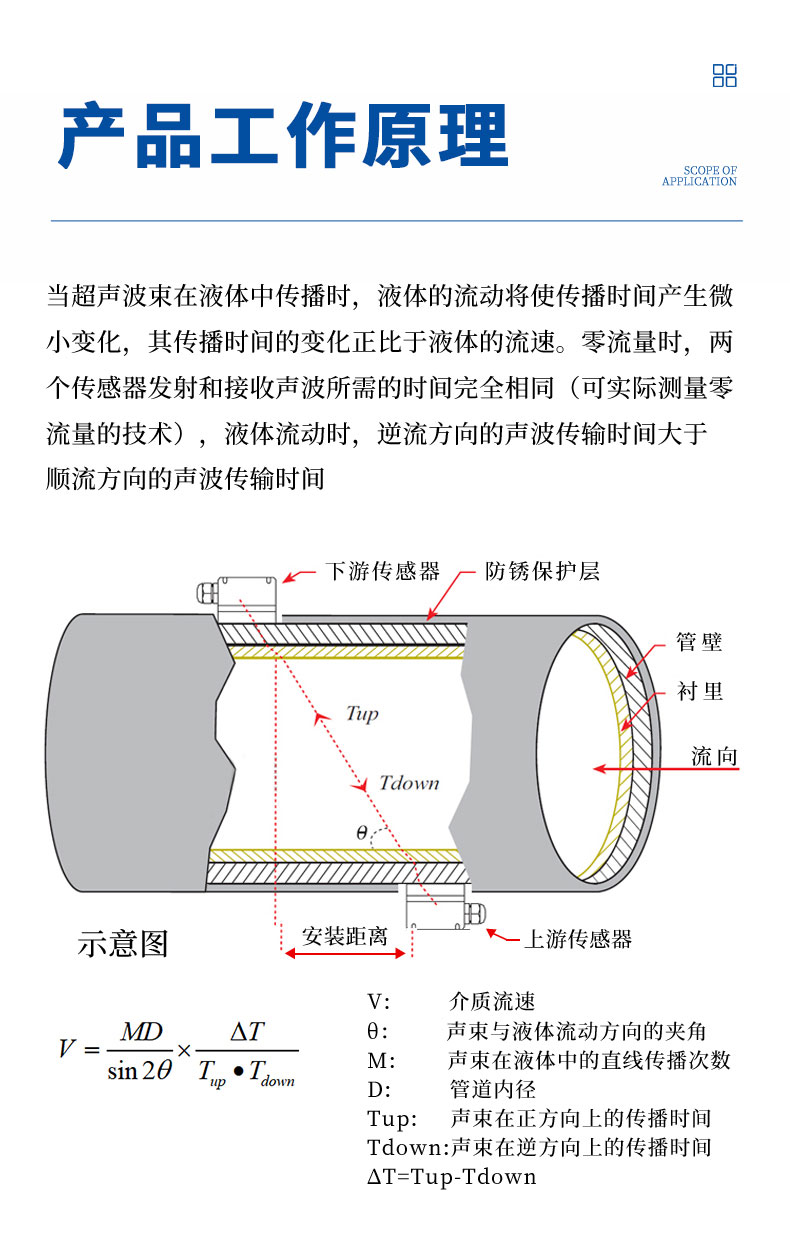 当超声波束在液体中传播时,液体的流动将使传播时间产生微小变化,其传播时间的变化正比于液体的流速,零流量时,两个传感器发射和接收声波所需的时间完全相同(唯一可实际测量零流量的技术),液体流动时,逆流方向的声波传输时间大于顺流方向的声波传输时间。
