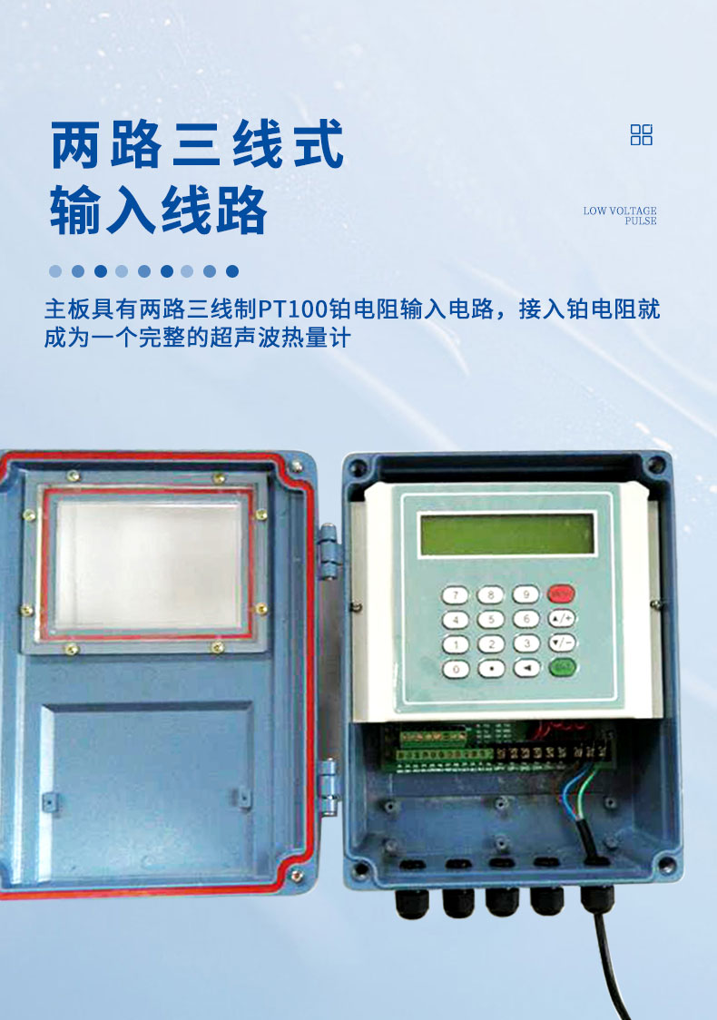 5、主板具有两路三线制PT100铂电阻输入电路,接入铂电阻就成为一个完整的超声波热量计。同时增加了温差灵敏度功能,防止长期低流速或者低温差时热量的无效累积。