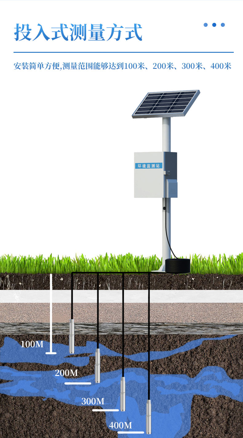 投入式水位监测设备根据压力与水深成正比的静水压力原理,运用水压敏感集成元器件做深井水位测量仪传感器探头,当传感器探头固定在水下某一测点时,该测点以上水柱压力高度加上该点的高程,即可间接测量出水位高低(水面到井口的距离);直接测量出的是传感器探头以上深井的液位实际高度。