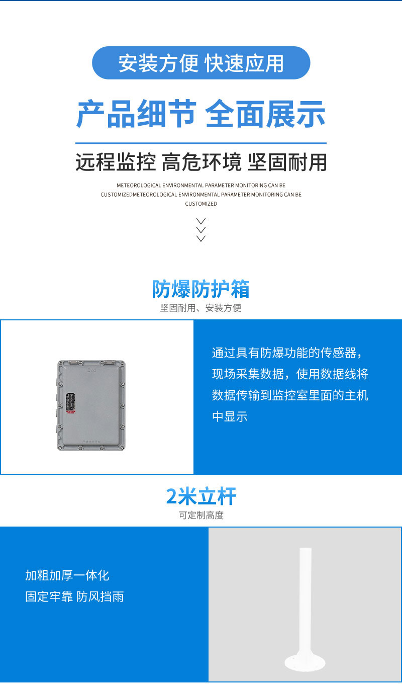 【产品简介】一、防爆型气象站产品简介防爆型气象站是天仪环境科技根据市场需求,针对化工厂、油库等特殊场所而研发生产的一款一体化气象站。它集数据采集、存储、通讯、显示于一体,通过有线通讯方式直接在···