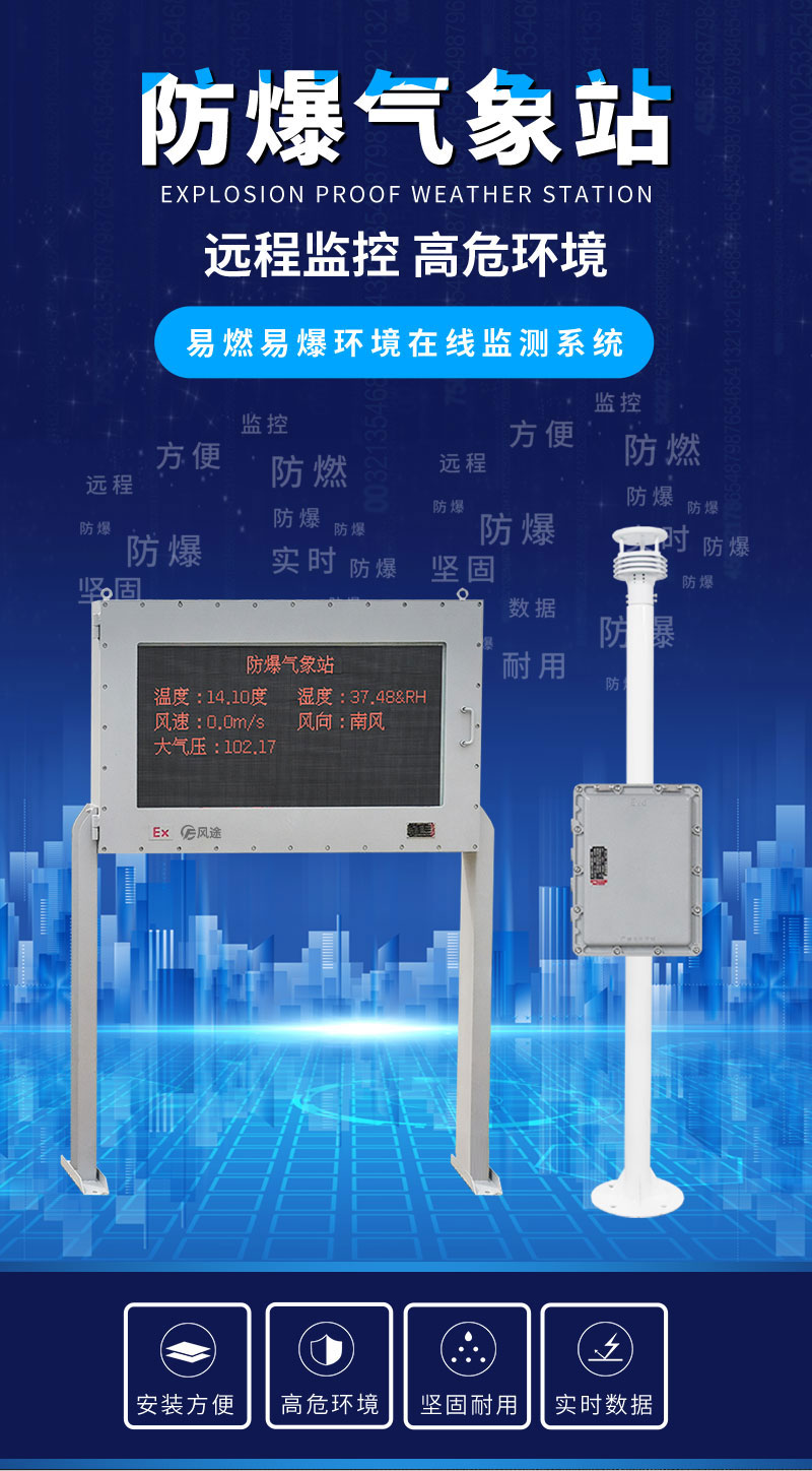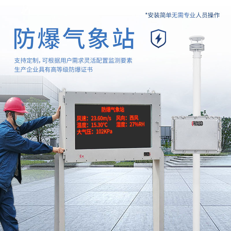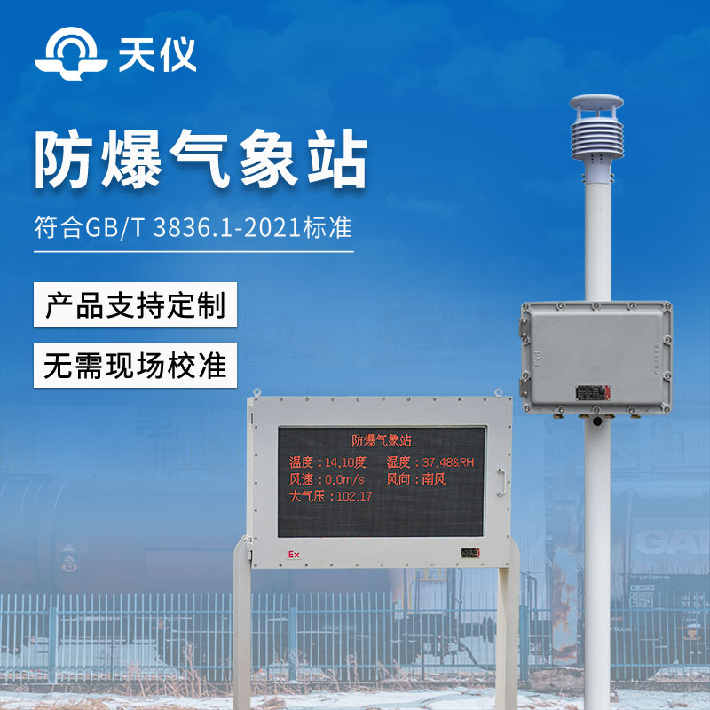 防爆型气象站是天仪环境科技根据市场需求,针对化工厂、油库等特殊场所而研发生产的一款一体化气象站。它集数据采集、存储、通讯、显示于一体,通过有线通讯方式直接在防爆屏幕实时显示数据。