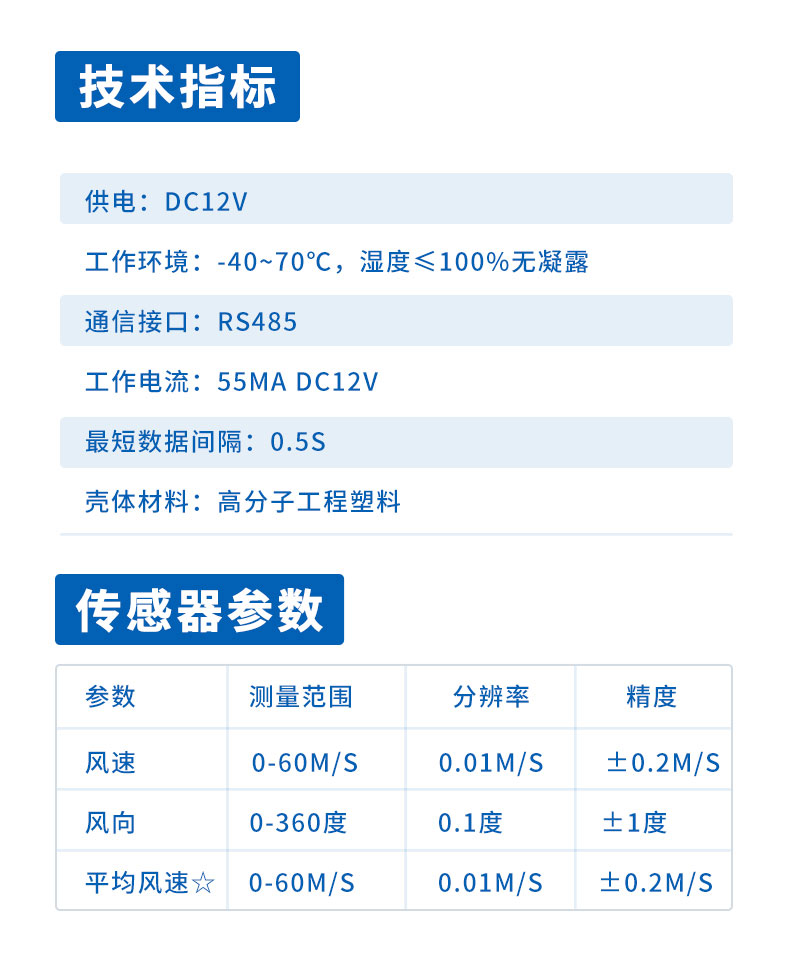 一、机械一体式风速风向传感器技术指标
