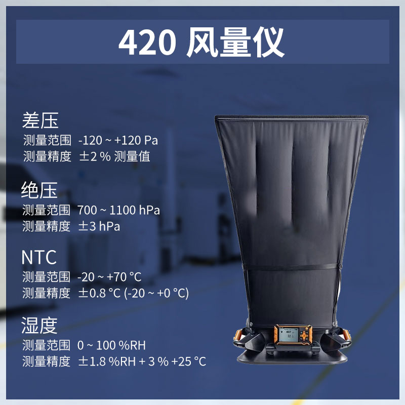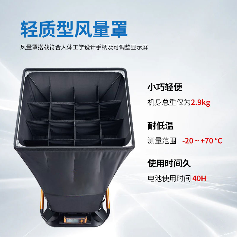【产品简介】一、风量罩产品简介风量罩适用于大型进风/回风口快速精准测量,满足法规体系要求确保室内空气质量。为医院,写字楼或商业建筑的空调暖通系统测量提供可靠的支持。内置气流整流栅,即使在涡流出···
