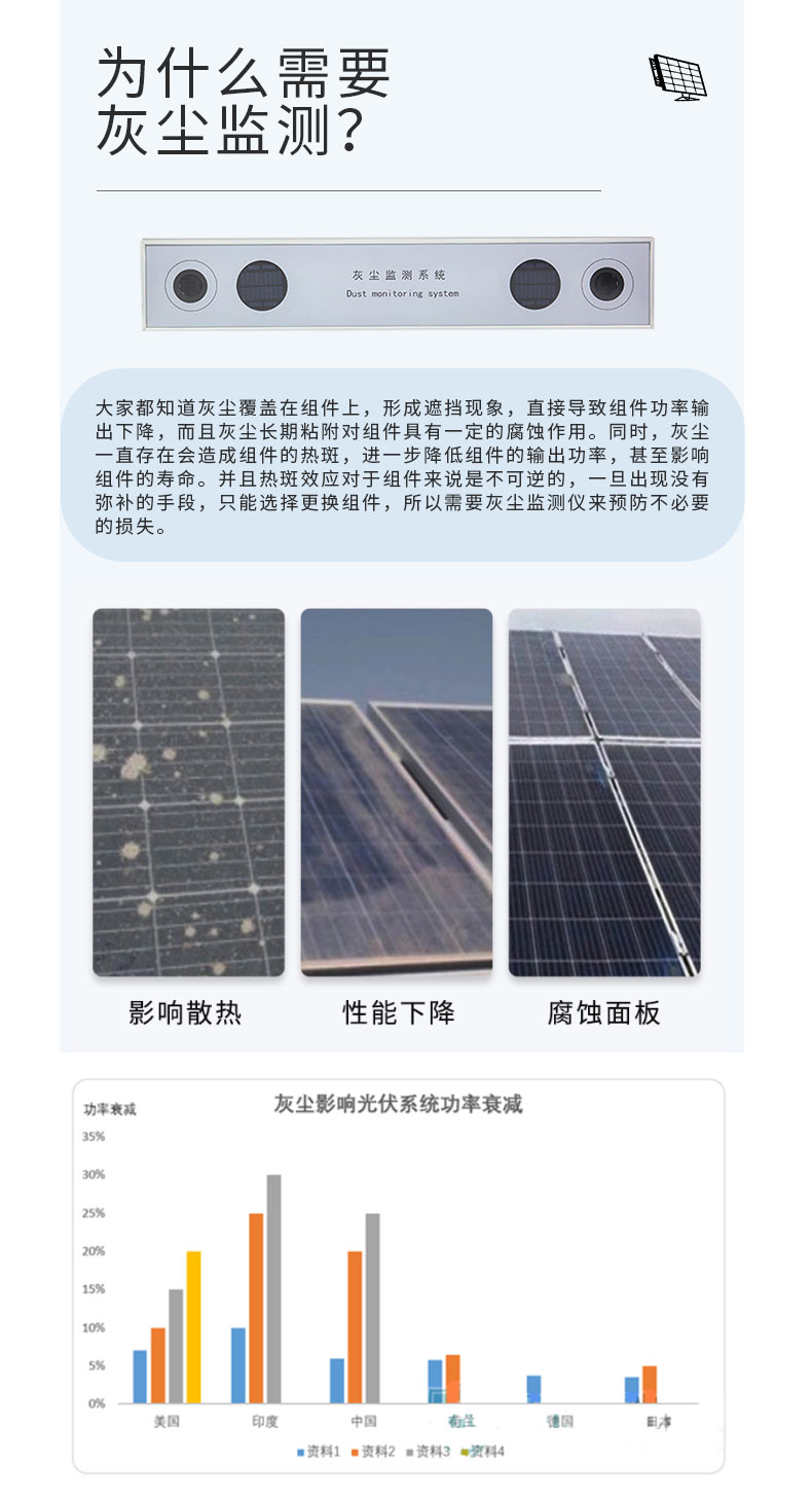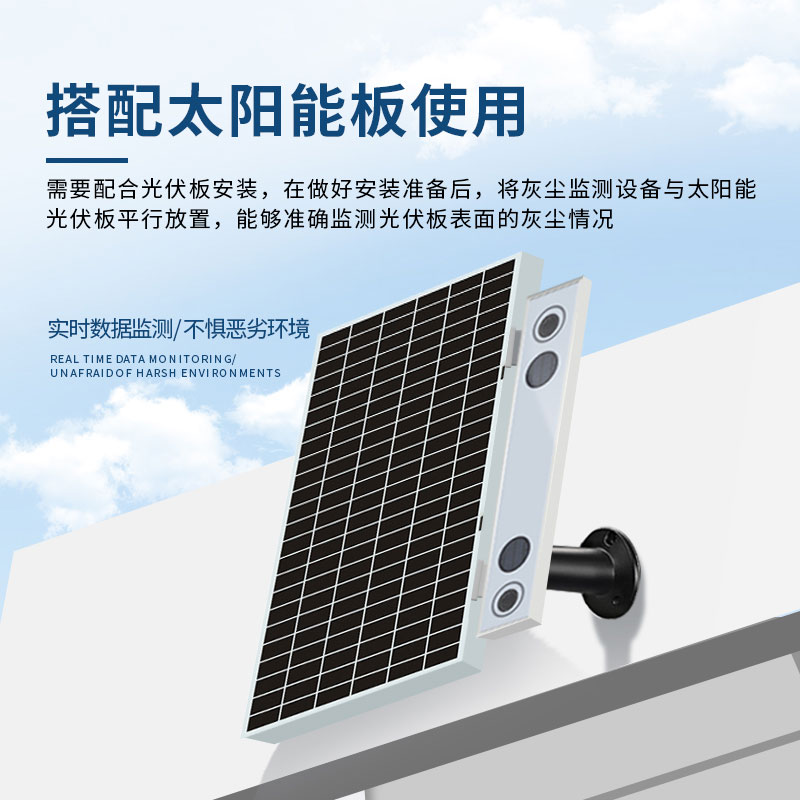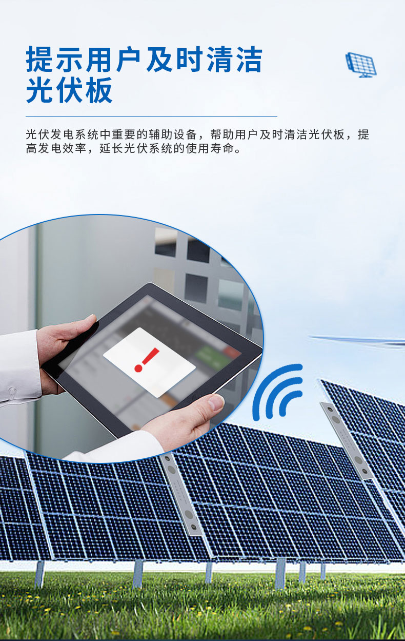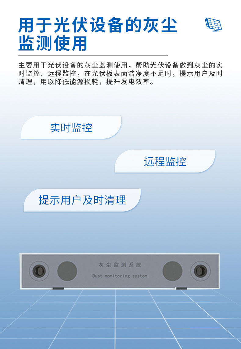 设备描述:光伏电站灰尘监测系统是一种用于监测光伏板表面灰尘覆盖情况的设备,主要用于提高光伏发电效率和维护光伏系统,主要功能和产品特点使其成为光伏发电系统中重要的辅助设备,帮助用户及时清洁光伏板,提高发电效率,延长光伏系统的使用寿命。