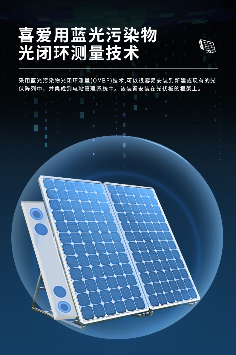 【产品简介】一、光伏电站灰尘监测系统产品概述太阳能组件玻璃上的污染物是快速影响光伏电站的主要问题之一,会降低发电效率和性价比。采用蓝光污染物光闭环测量(OMBP)技术,可以很容易安装到新建或现···