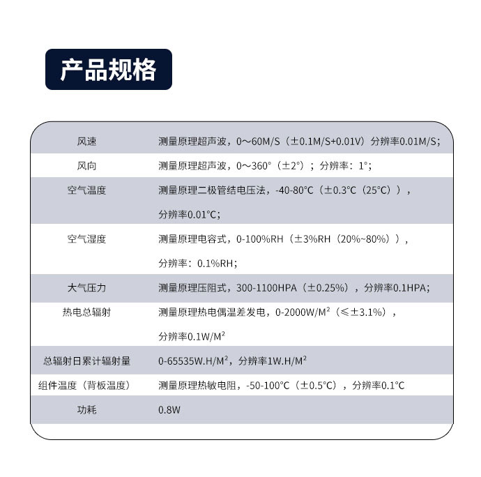 2、风向:测量原理超声波,0~360°(±2°);分辨率:1°;