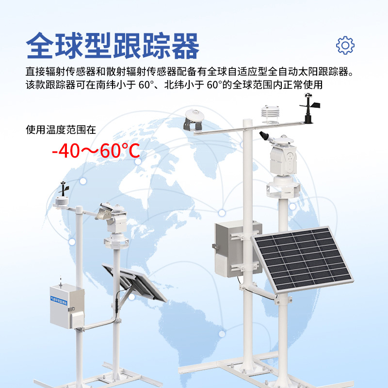 6、全球型跟踪器:直接辐射传感器和散射辐射传感器配备有全球自适应型全自动太阳跟踪器。该款跟踪器可在南纬小于60°、北纬小于60°的全球范围内正常使用,使用温度范围在-40~60℃