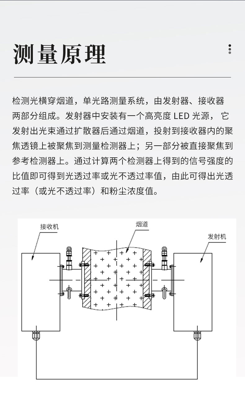 检测光横穿烟道,单光路测量系统,由发射器、接收器两部分组成。发射器中安装有一个高亮度LED光源, 它发射出光束通过扩散器后通过烟道,投射到接收器内的聚焦透镜上被聚焦到测量检测器上;另一部分被直接聚焦到参考检测器上。通过计算两个检测器上得到的信号强度的比值即可得到光透过率或光不透过率值,由此可得出光透过率(或光不透过率)和粉尘浓度值。