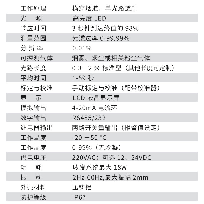 | 工作原理 | 横穿烟道、单光路透射 |
