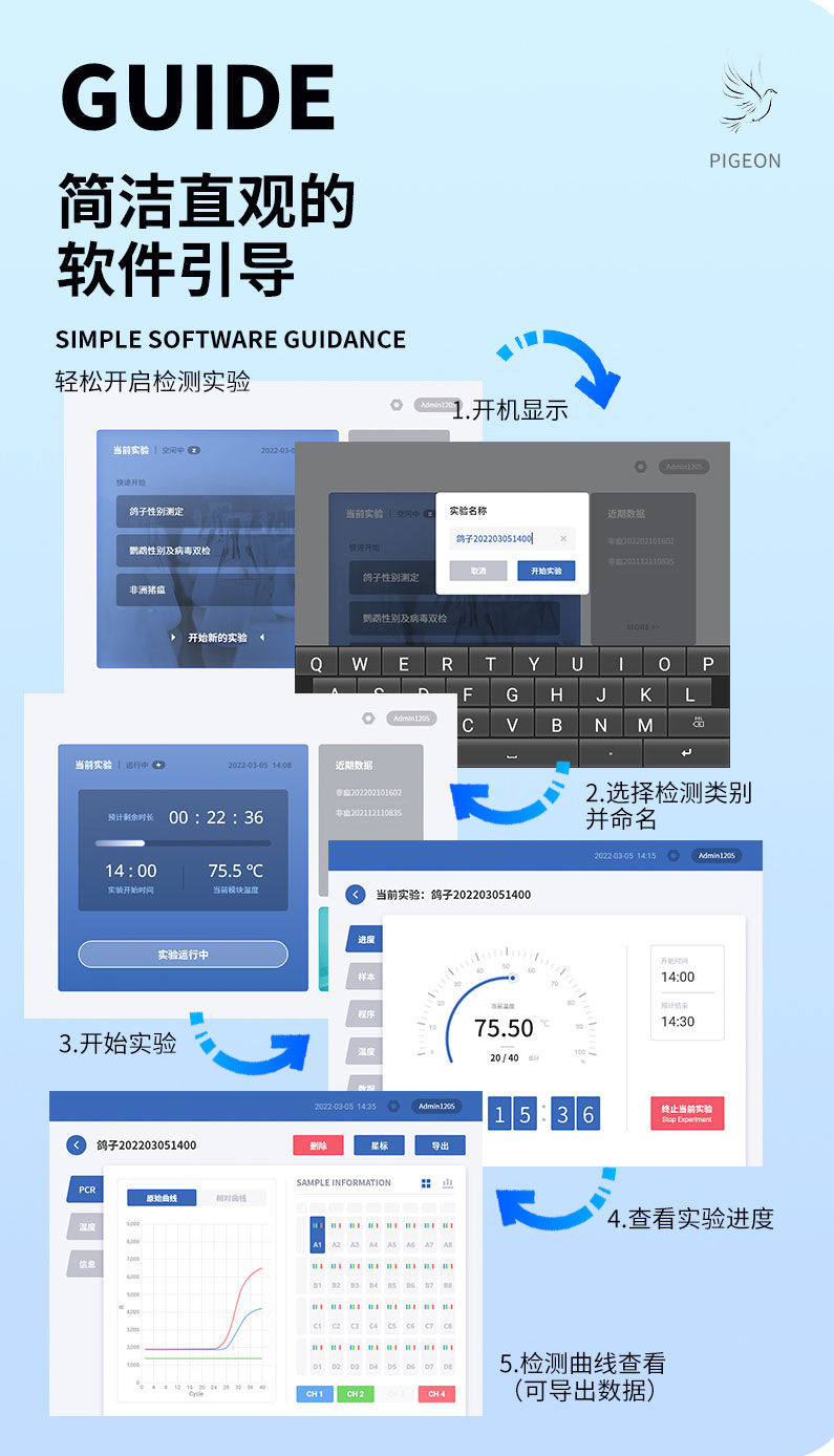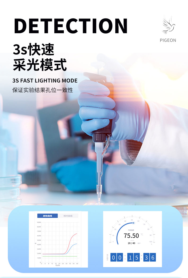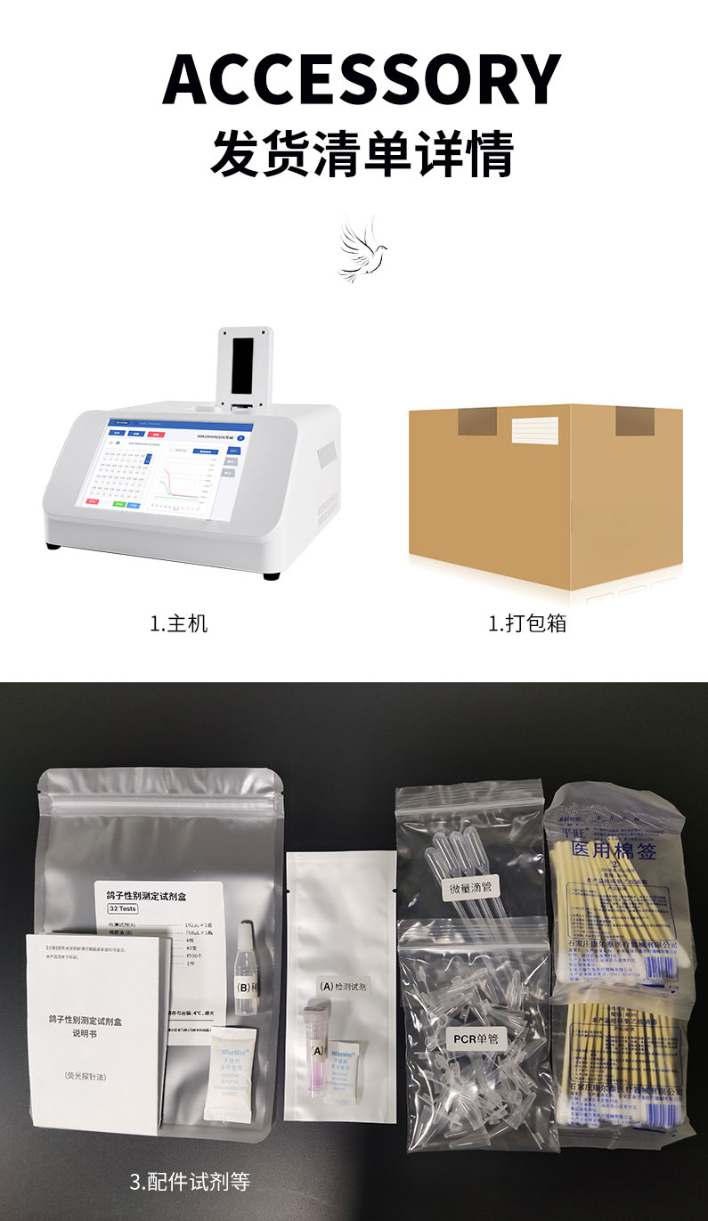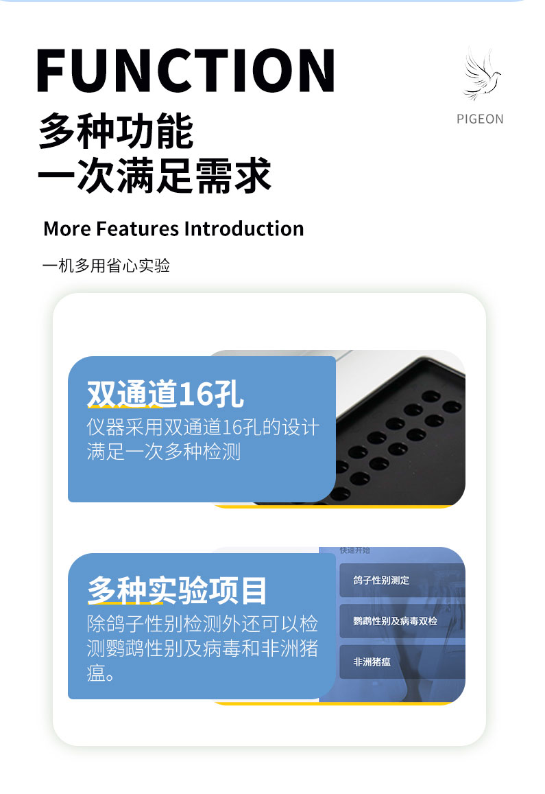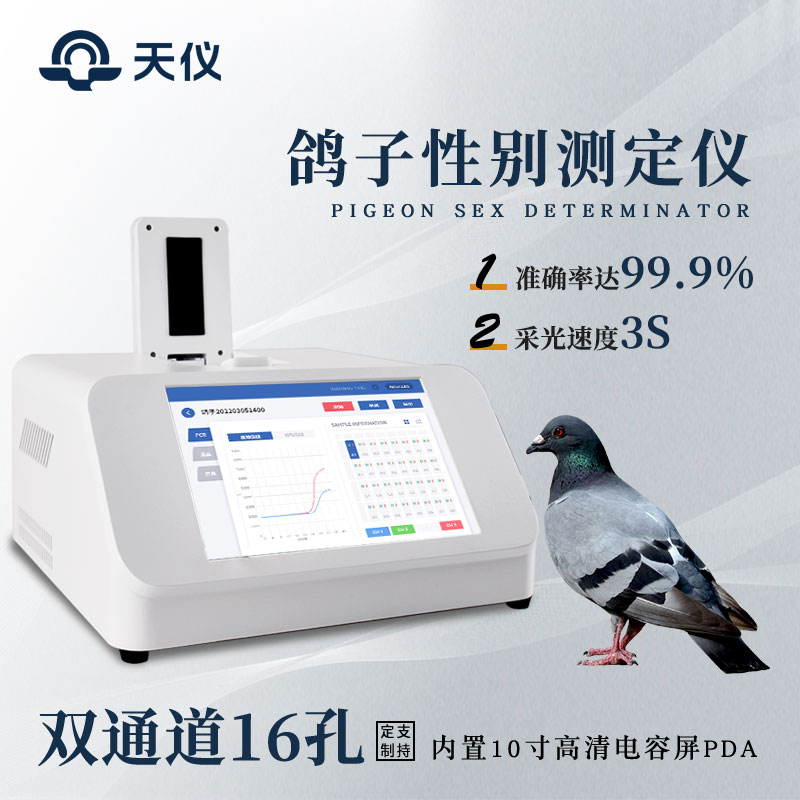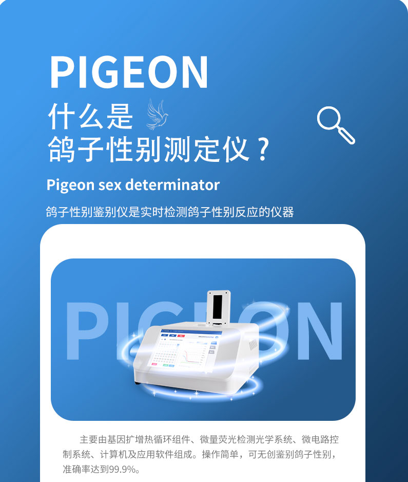 鸽子性别鉴别仪是实时检测反应的仪器,主要由基因扩增热循环组件、微量荧光检测光学系统、微电路控制系统、计算机及应用软件组成。操作简单,可无创鉴别鸽子性别,准确率达到99.9%。