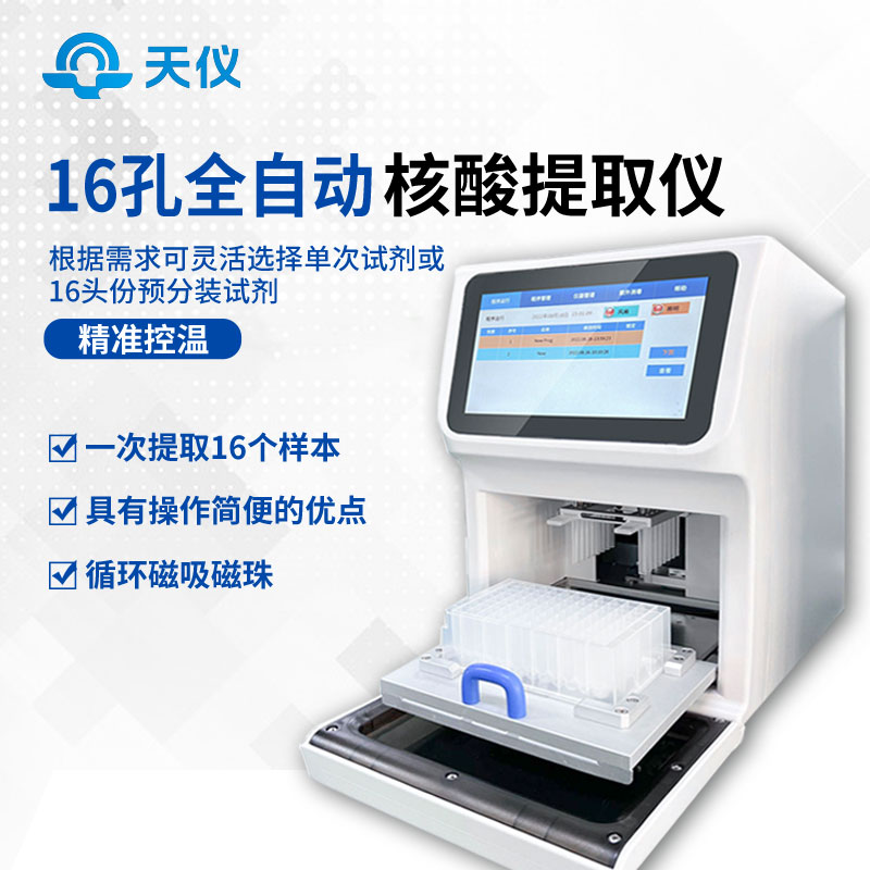 【产品简介】核酸提取仪产品概述:16孔位核酸提取仪通过磁珠法提取核酸,选择相应的试剂盒就可以自动的从多种样品材料如血液、组织、细胞中分离纯化高纯度的核酸。具有兼容性强(适配16头份提取试剂,也···