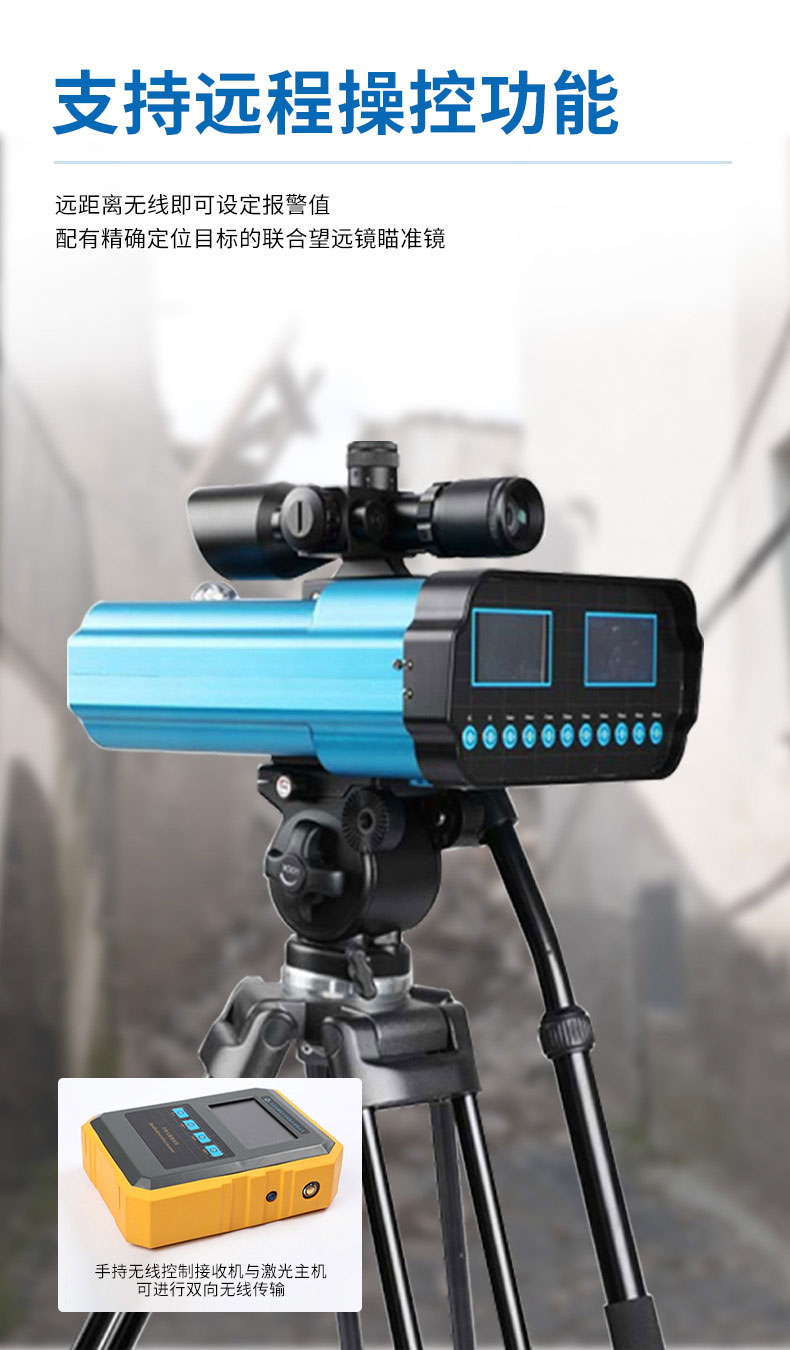 2.可通过无线接收前端双路激光监测数值、设置值、双路激光报警值及电压。具有照明功能,可调节激光发射器报警数值,也可重置报警值。