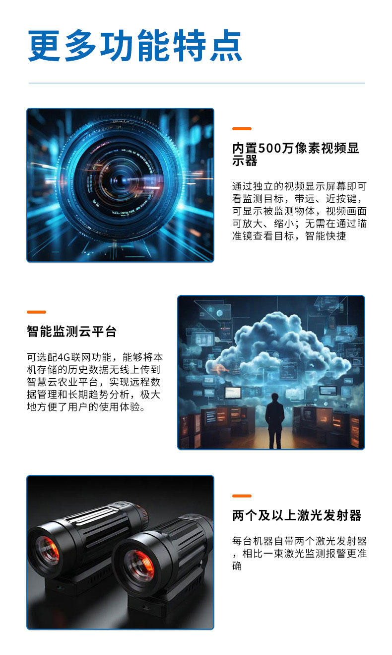 3.每台机器自带两个激光发射器,相比一束激光监测报警更准确;