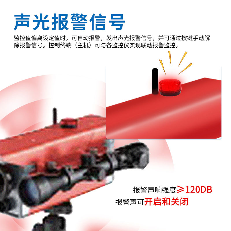 10.报警阈值可根据需要调节,支持固定报警值和任意设定报警值两种方式。倾角监控仪可通过快捷键设置7档固定报警阀值0.5°、1.0°、2.6°、5.0°、8.0°、10.0°、20.0°,也可步进设置0.1°,可调节范围:0.1-90°,任意刻度值连续可调。位移监控仪可通过快捷键设置9档固定报警阀值:5、10、15、20、30、50、70、80、100mm,也可步进设置1mm,可调节范围:1-9999mm,任意刻度值连续可调。▲