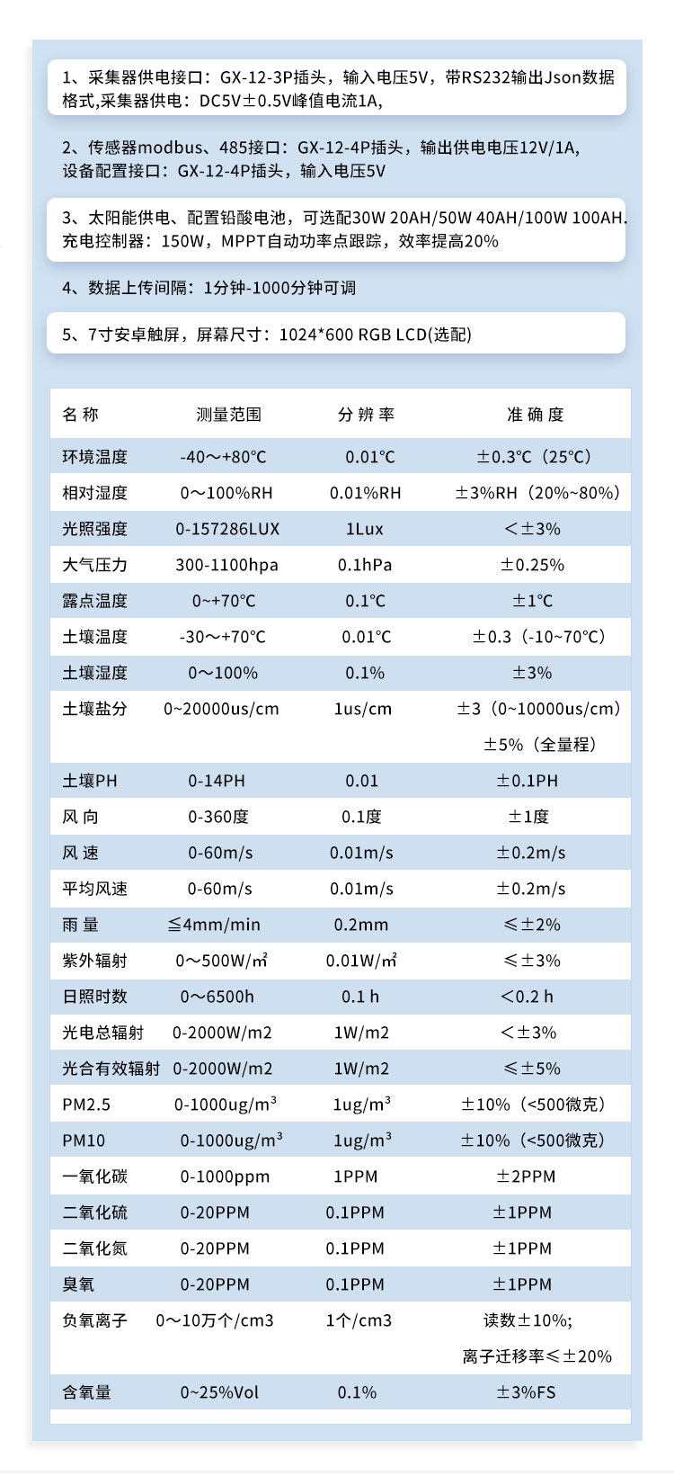 | 光电总辐射 | 0-2000W/m2 | 1W/m2 | <±3% |