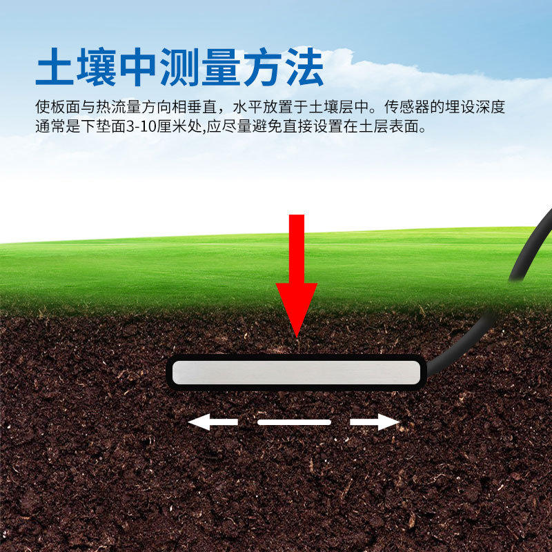 应该使板面与热流量方向相垂直,水平放置于土壤层中。传感器的埋设深度,通常是距自然下垫面3-10厘米深处,应尽量避免直接设置在土层表面,因为自然下垫面并非几何平面,表面的微小起伏将使传感器读数失去代表性,同时传感器的上表面直接与空气接触也可能产生辐射误差。通常在观测场地选择一块具有代表性的地段,用铲刀垂直向下挖一剖面,