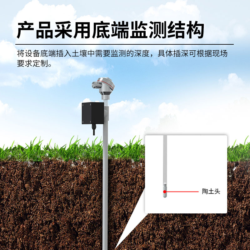 2.整机结构:产品采用底端监测结构,将设备底端插入土壤中需要监测的深度,具体插深可根据现场要求定制。