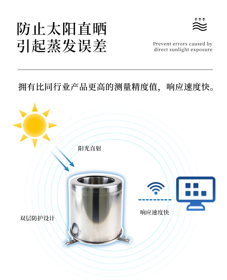 1.可以防止太阳直晒引起的蒸发误差,拥有比同行业产品更高的测量精度值,响应速度快;