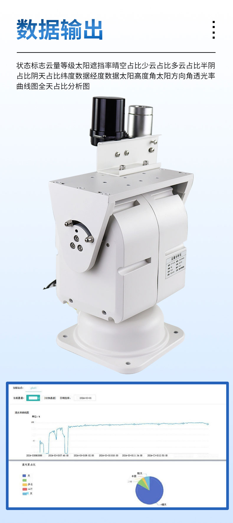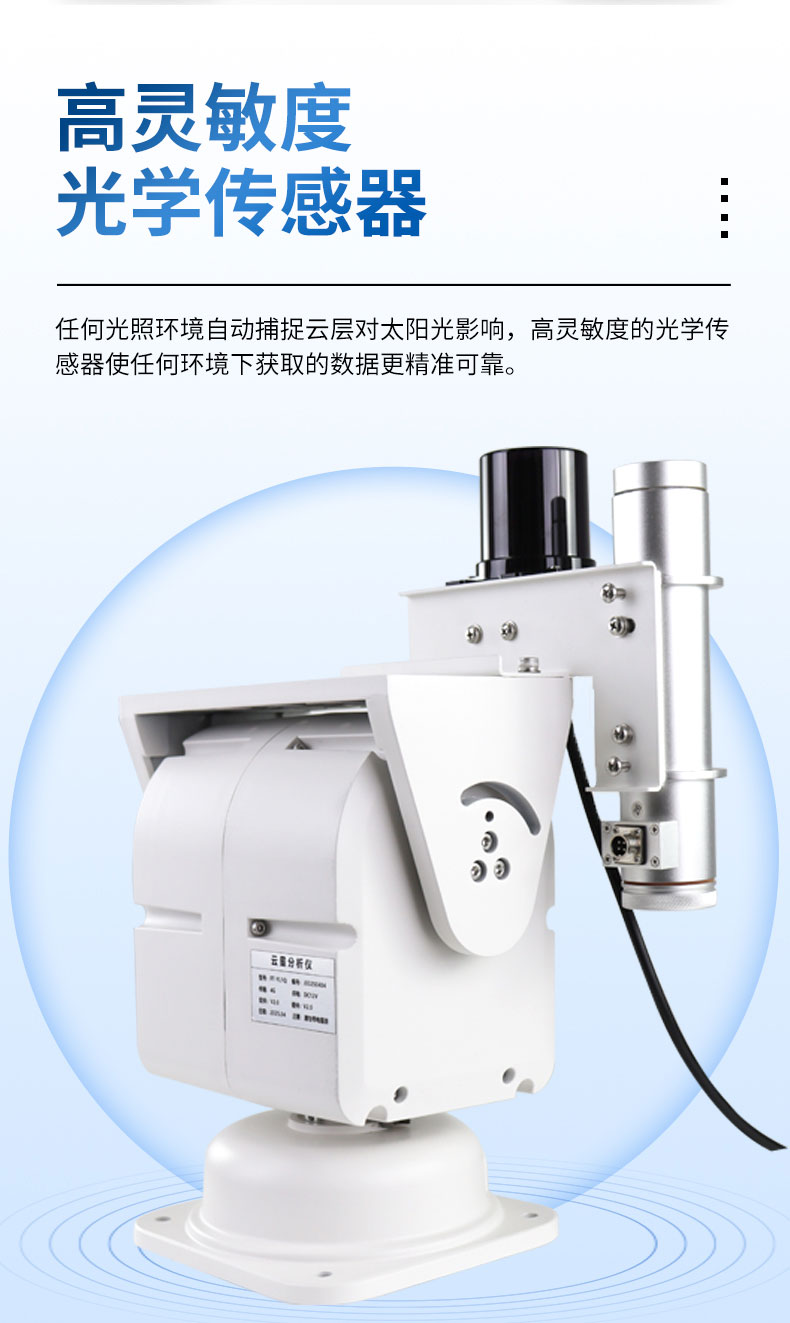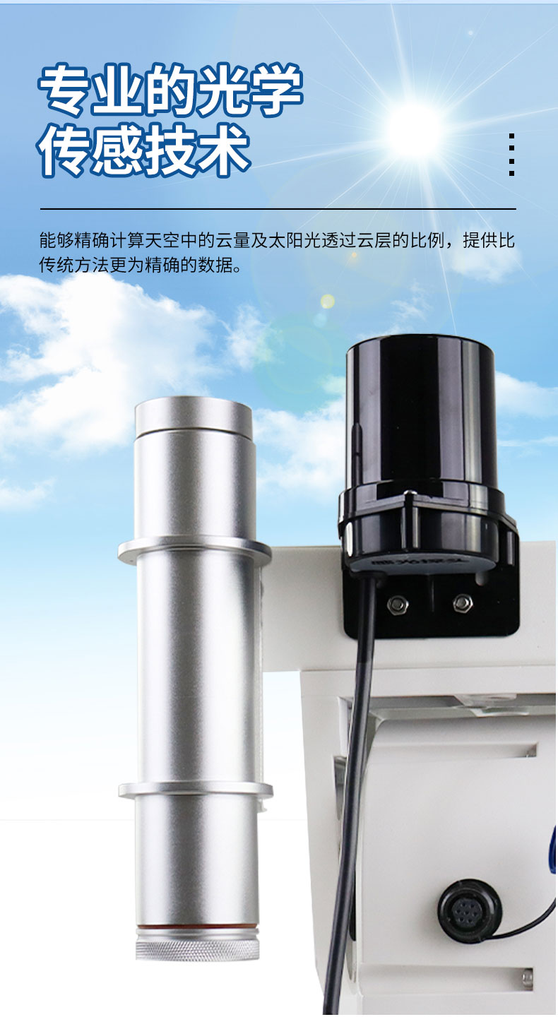 【产品简介】云量分析仪详细产品介绍及技术参数云量分析仪利用先进的机器学习技术和尖端的大模型算法,结合专业的光学传感技术,能够精确计算天空中的云量及太阳光透过云层的比例,提供比传统方法更为精确的···
