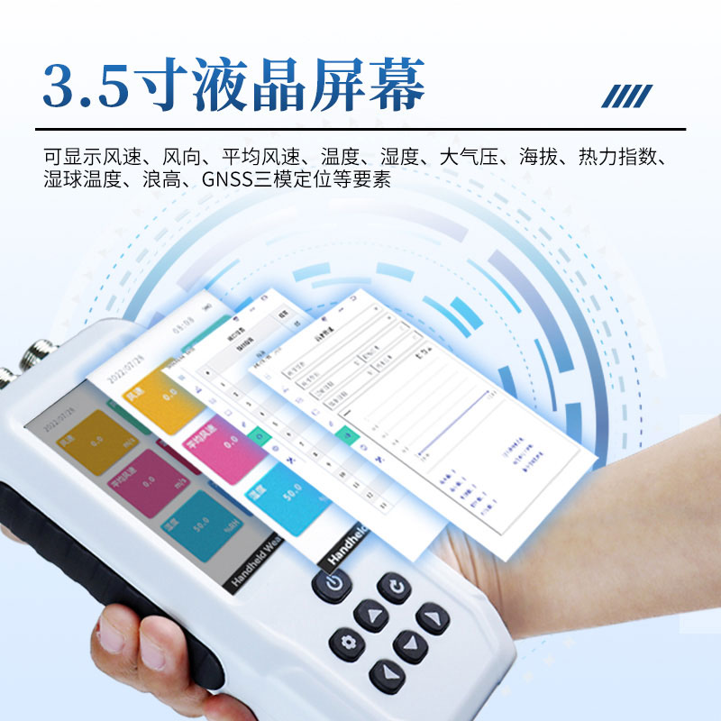 1.液晶屏幕3.5寸,可显示风速、风向、平均风速、温度、湿度、大气压、海拔、热力指数、湿球温度、浪高、露点温度、风寒指数、GNSS三模定位等要素。☆