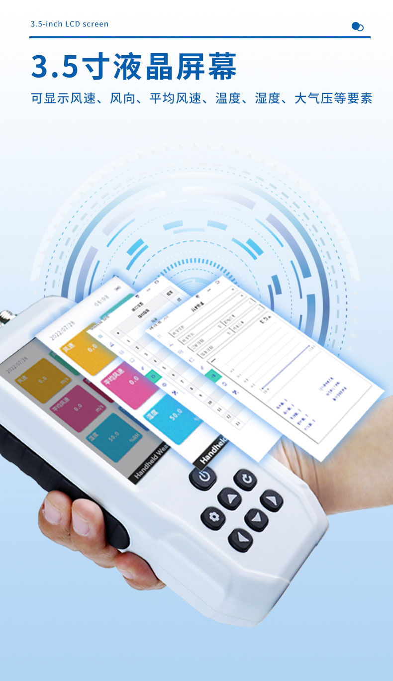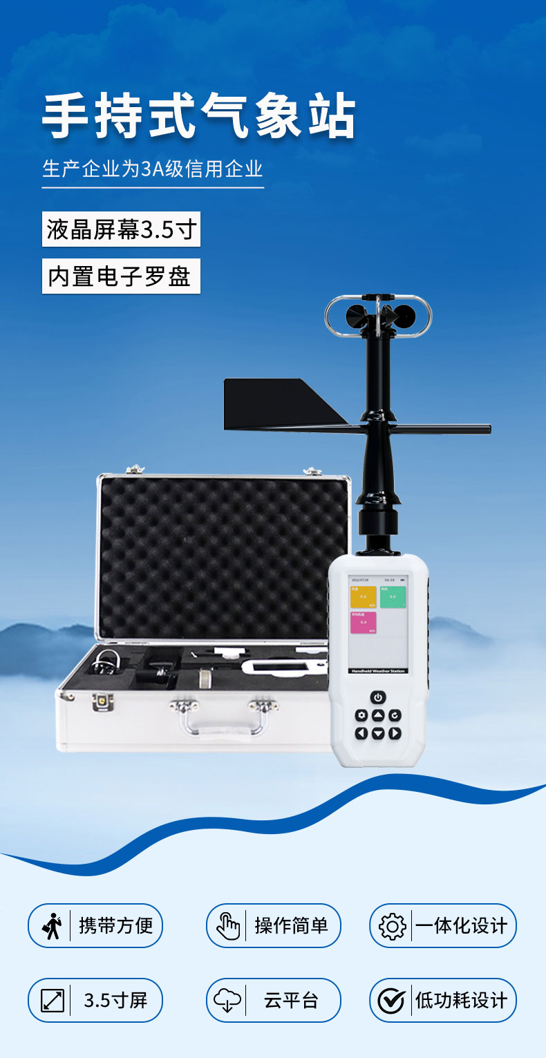 【产品简介】一、手持气象站产品简介是一款携带方便,操作简单,集多项气象要素于一体的可移动式气象观测仪器。系统采用精密传感器及智能芯片,能同时对风速、风向、平均风速、温度、湿度、大气压、海拔、热···