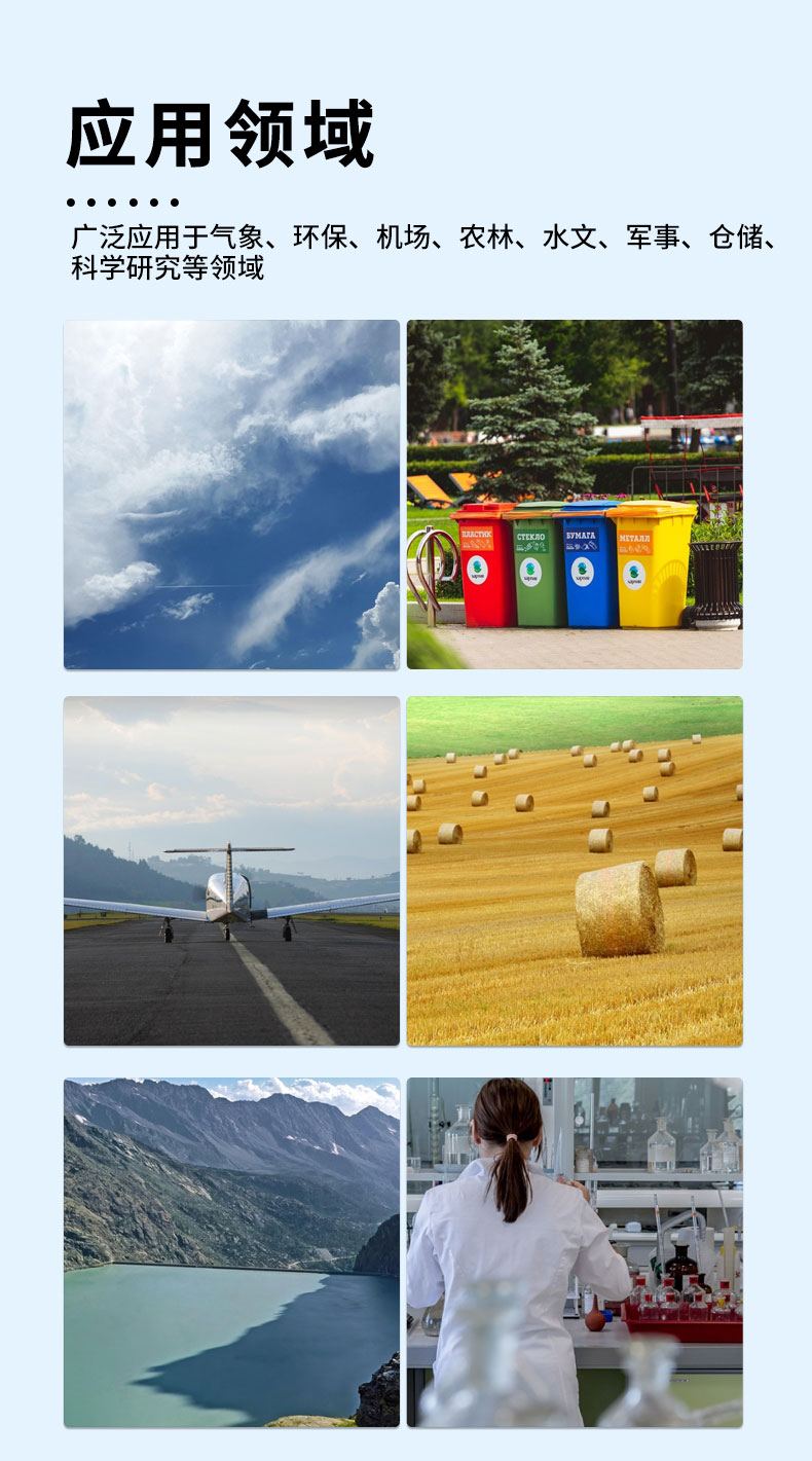 本仪器可广泛应用于气象、环保、机场、农林、水文、军事、仓储、科学研究等领域。