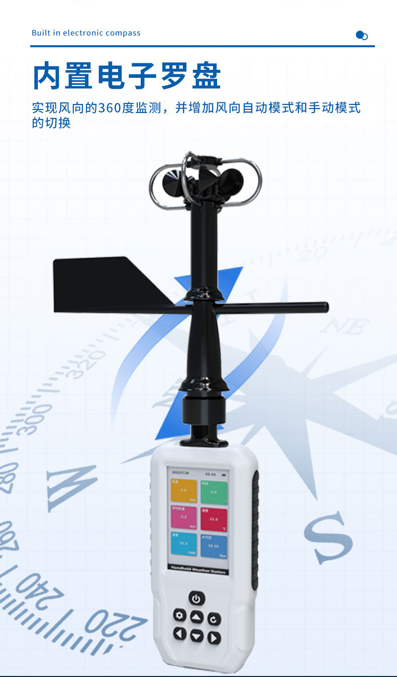 2.内置电子罗盘,实现风向的360度监测,并增加风向自动读取和手动读取的切换。☆