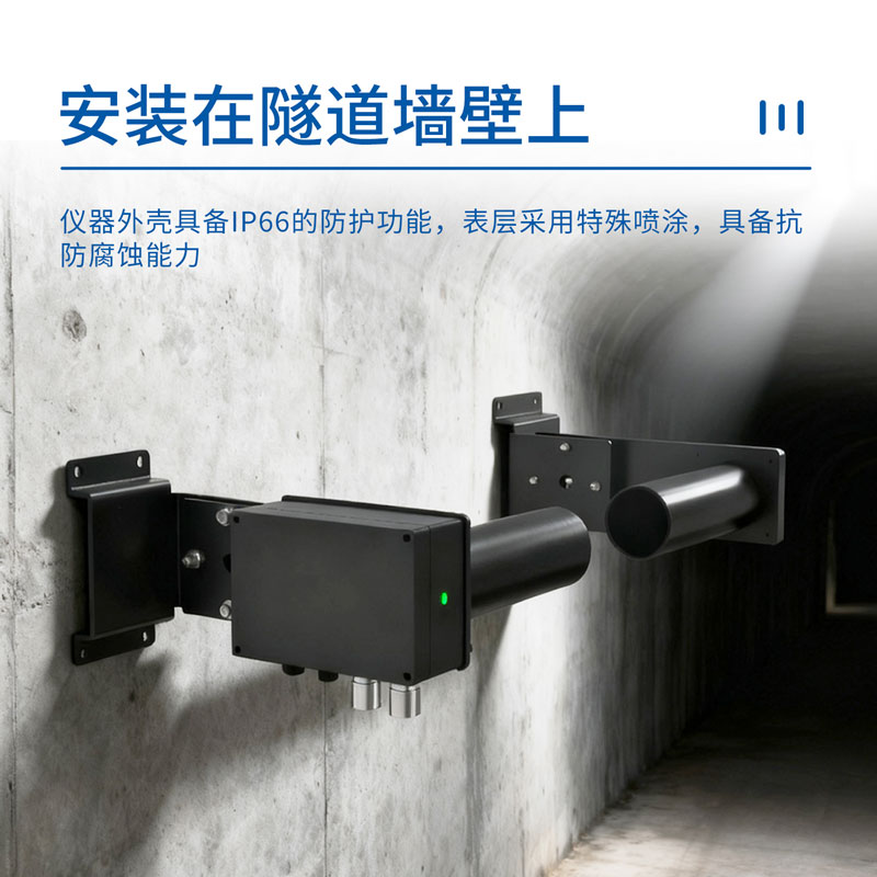 隧道能见度检测器根据透射原理工作,发射/接收器和反射器相对安装,利用支架固定对准后,光学部件发出的高聚焦光束成为一条检测光束,安装距离间隔3米(往返双光路,实际检测光程为6米),由于尘埃的衰减,接收器得到信号后处理为测量值。根据我国《公路隧道通风照明设计规范》要求,装在隧道顶部或者侧壁上。