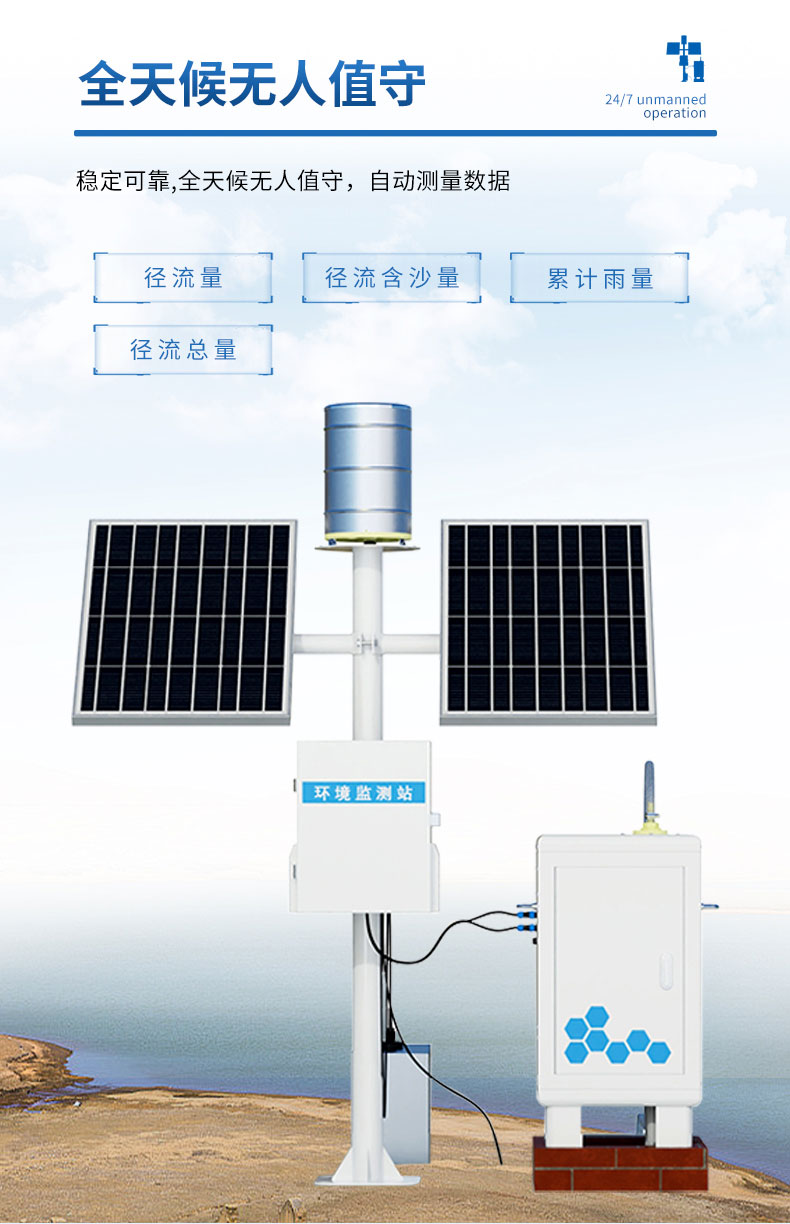 1、全天候无人值守,自动测量:径流量、径流含沙量、径流总量、累计雨量。