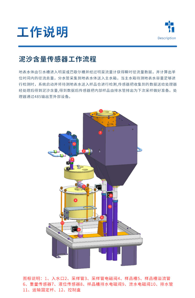 泥沙含量传感器工作流程:地表水体由引水槽进入明渠或巴歇尔槽并经过明渠流量计获得瞬时径流量数据,并计算出单位时间内的径流总量,分水管采集到地表水体送入主水箱,当主水箱待测地表水容量足够进行检测时,系统启动并将待测地表水送入样品仓进行检测,传感器把收集到的数据送给处理器经处理后得到泥沙含量,得到数据后传感器把内部样品由排水管排出为下次采样做好准备。处理器通过485输出至外部设备。