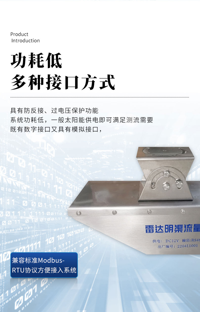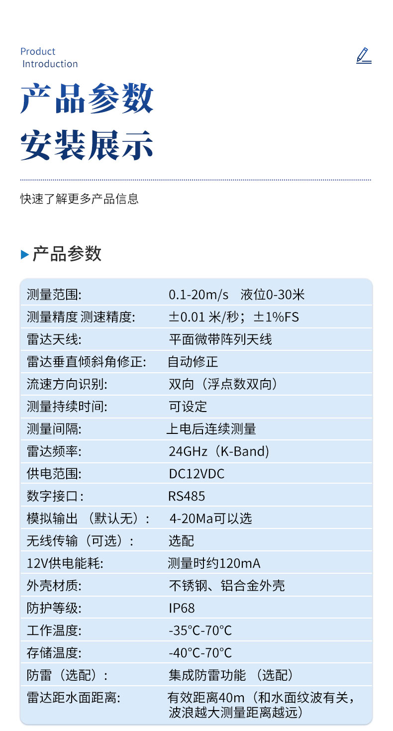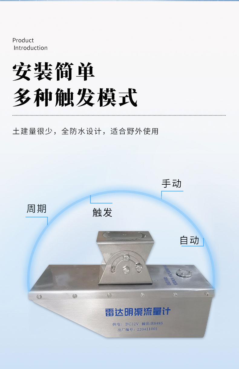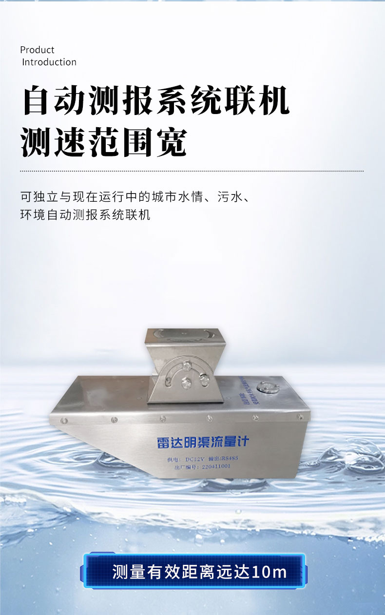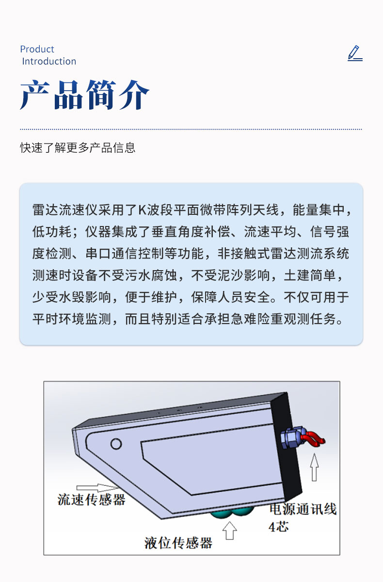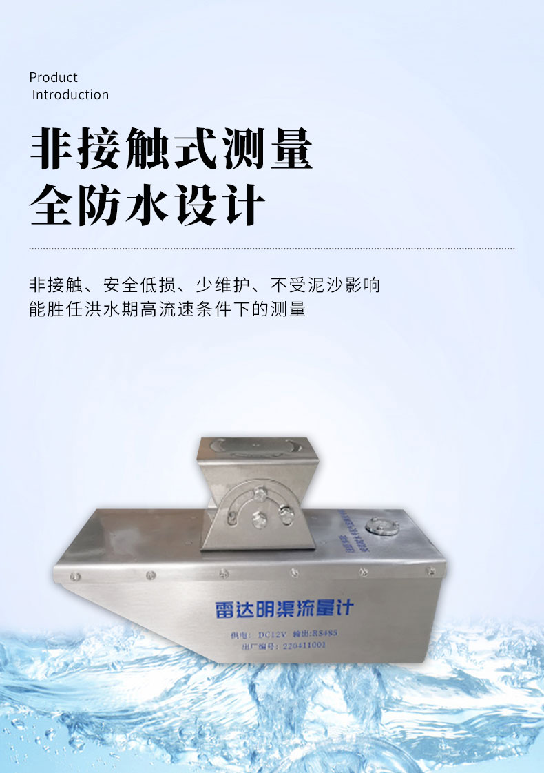 【产品简介】一、雷达流量计产品简介我司研发的雷达流量计采用了K波段平面微带阵列天线,能量集中,低功耗;仪器集成了垂直角度补偿、流速平均、信号强度检测、串口通信控制等功能,非接触式雷达测流系统测···