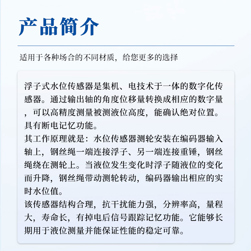 【产品简介】一、浮子水位计产品简介浮子水位计是集机、电技术于一体的数字化传感器。通过输出轴的角度位移量转换成相应的数字量,可以高精度测量被测液位高度,能确认绝对位置。具有断电记忆功能。其工作原···